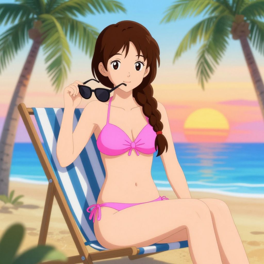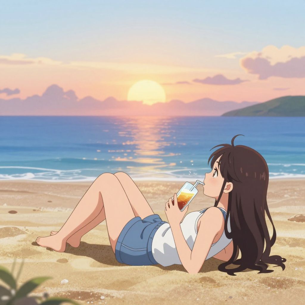 Anime-style drawing of a girl with long black hair, wearing a white tank top and blue shorts, lying on a sandy beach at sunset, sipping