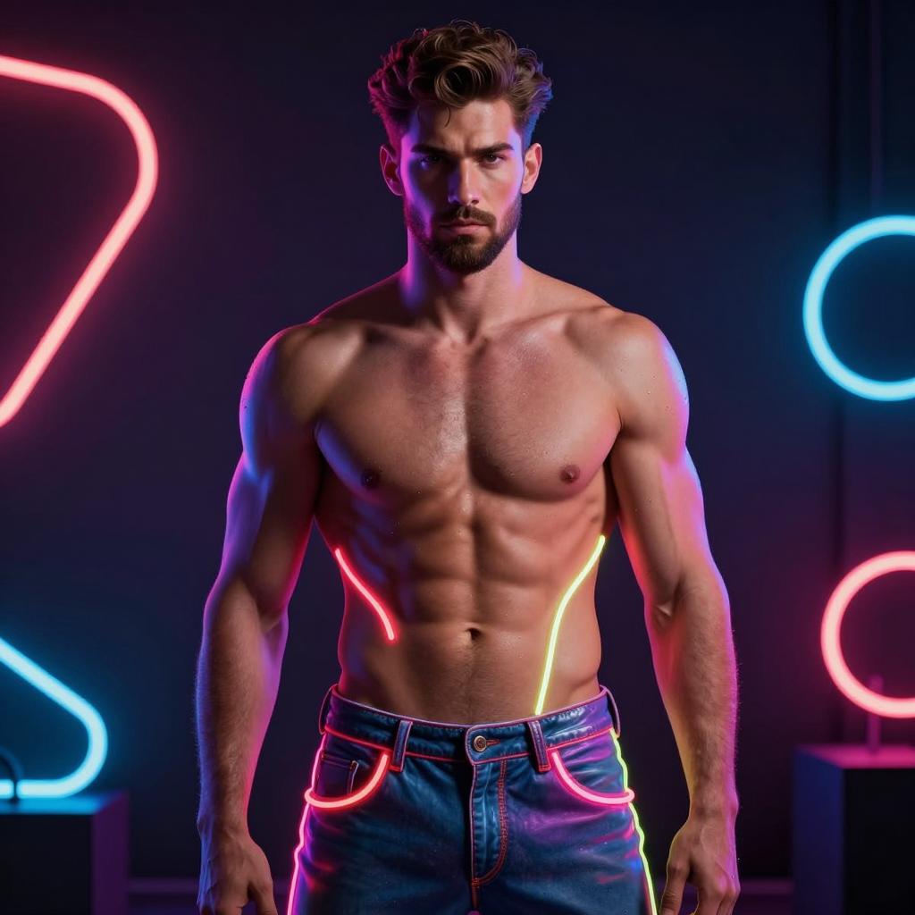 Photorealistic image of a muscular shirtless man with brown hair and a beard, standing against a dark background with various neon light shapes. The man has colorful neon outlines glowing on his body and jeans pockets, featuring vibrant colors and a futuristic aesthetic. The composition is symmetrical with intense low lighting creating a 3D effect.