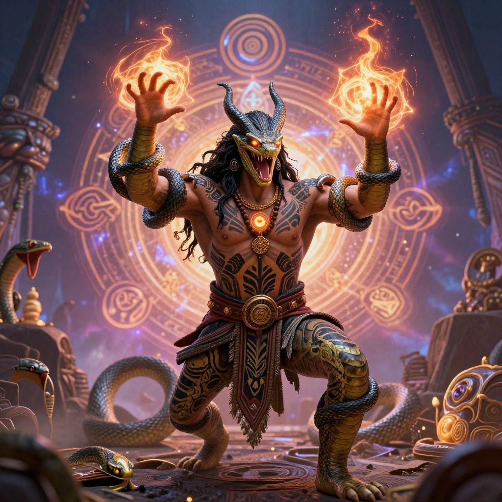 Snake man DnD shaman casting a powerful spell, serpents entwined around his arms, glowing eyes and tribal tattoos, mystical tribal setting with swirling magical symbols, vibrant colors