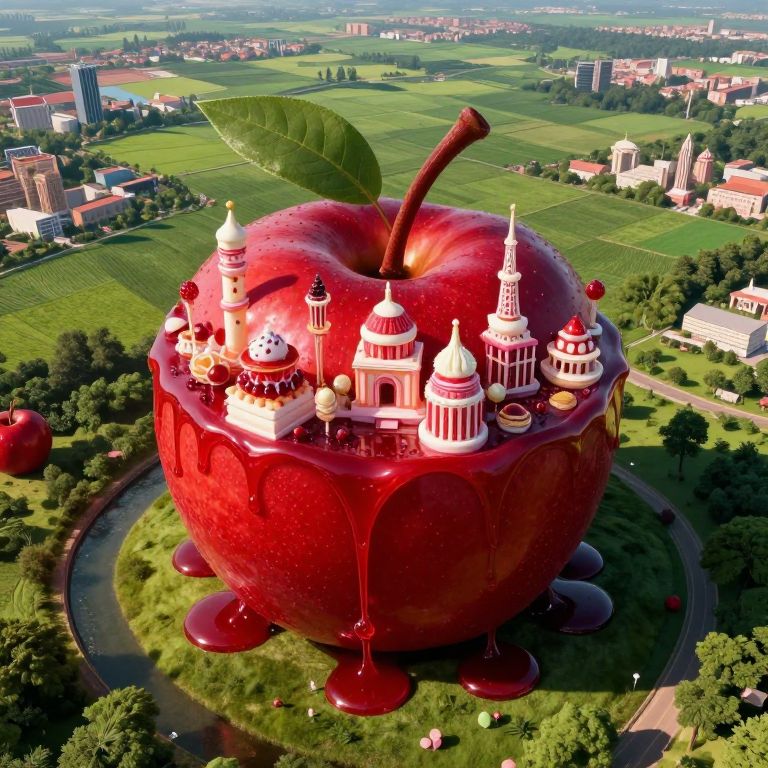 Craft an alluring dreamscape in the vein of surrealism, showcasing a vibrant red fruit transforming into an extraordinary landscape replete with towering confectionery structures and rivers of flowing syrup. From above verdant fields, this aerial view juxtaposes the purity of nature against the opulence of urban realms, blending innocence and grandeur in a whimsical fusion. Dramatic sunlight illuminates the scene, casting deep shadows that accentuate the playful sweetness and enigmatic ambiance of this fantastical amalgamation.