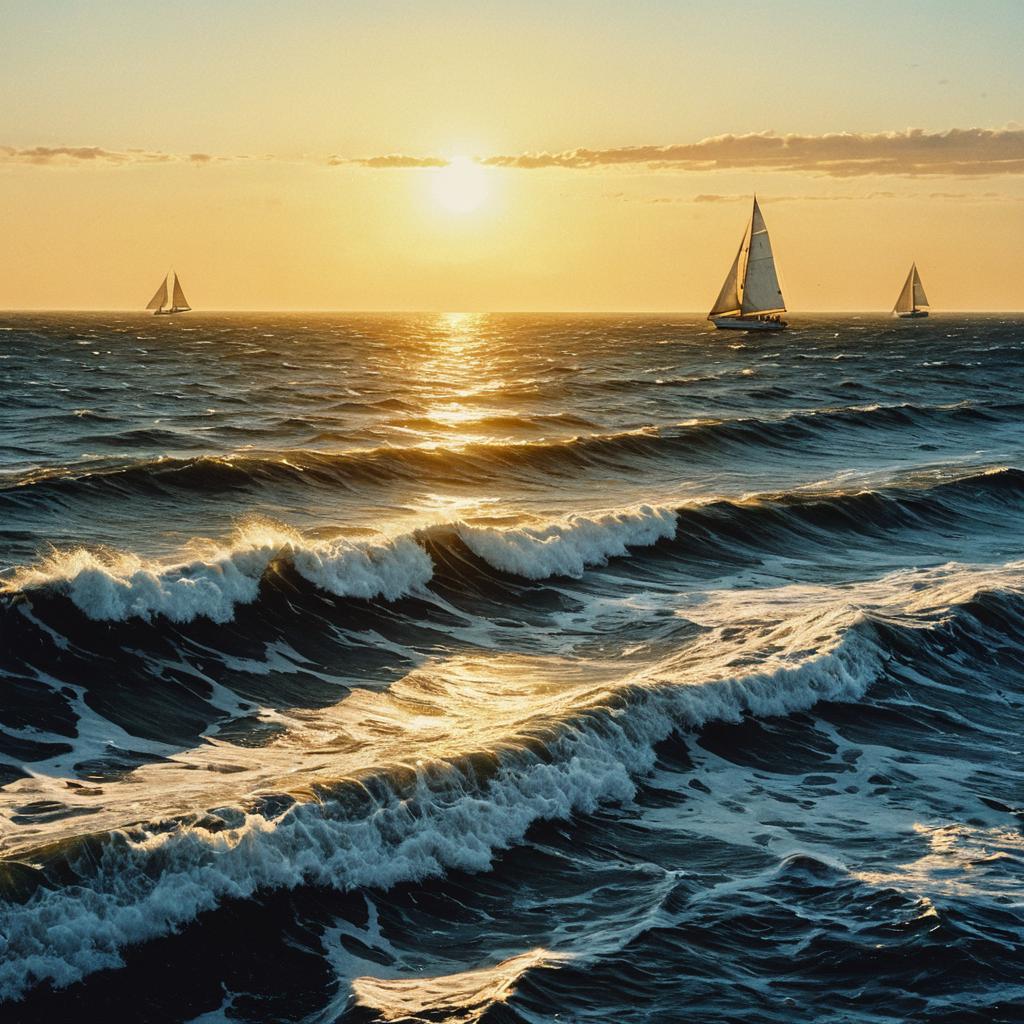 A vast ocean stretching to the horizon, featuring golden sunlight glimmering on the waves with distant sailboats, painted in realistic maritime painting style, evoking a calming and expansive feeling