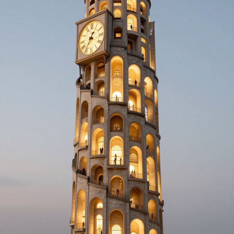 A towering spiral clocktower ascends endlessly into the sky, its levels glowing with warm light and archways leading to unseen worlds, as tiny figures navigate its impossible depths.