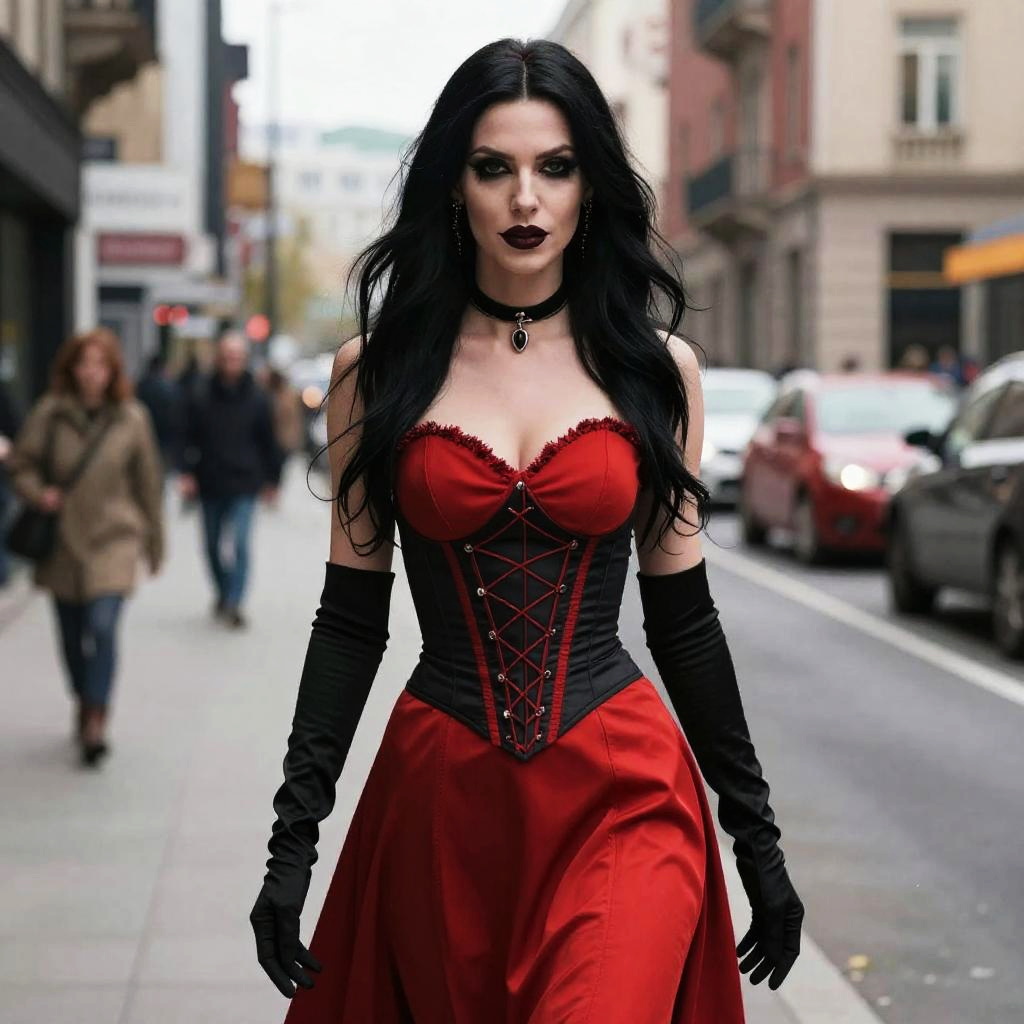 Vampy Woman in Red and Black Dress on City Street