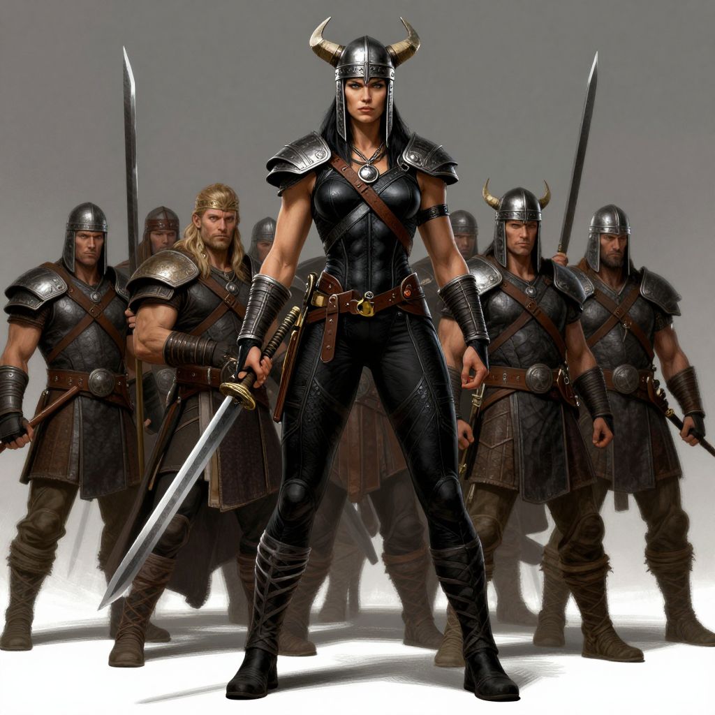 Digital artwork of a muscular, dark-haired woman in black leather armor and horned helmet, standing confidently with a sword, flanked by five burly