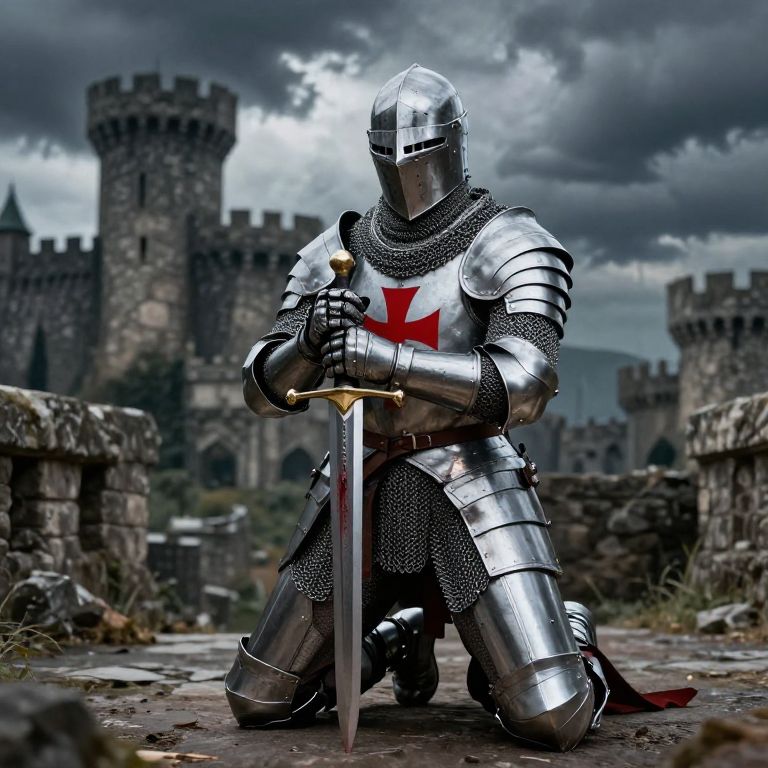 Knight in shiny silver armor kneels, gripping sword with red cross, in front of a stormy sky and medieval castle ruins. Photorealistic digital