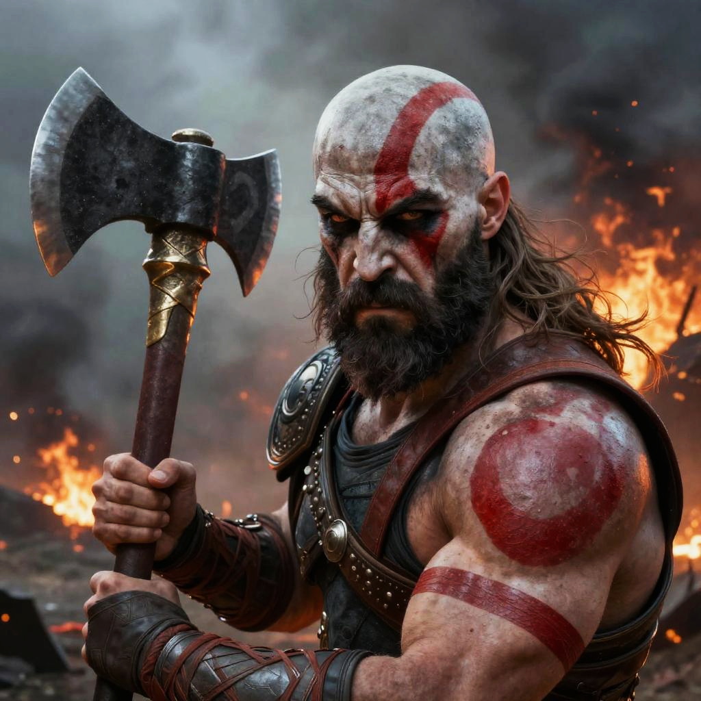God of war face paint inspired by tribal mythology, bold geometric shapes accentuating aggressive features, weathered skin, piercing eyes, traditional war gear with leather and metal, dramatic shadows, cinematic composition.