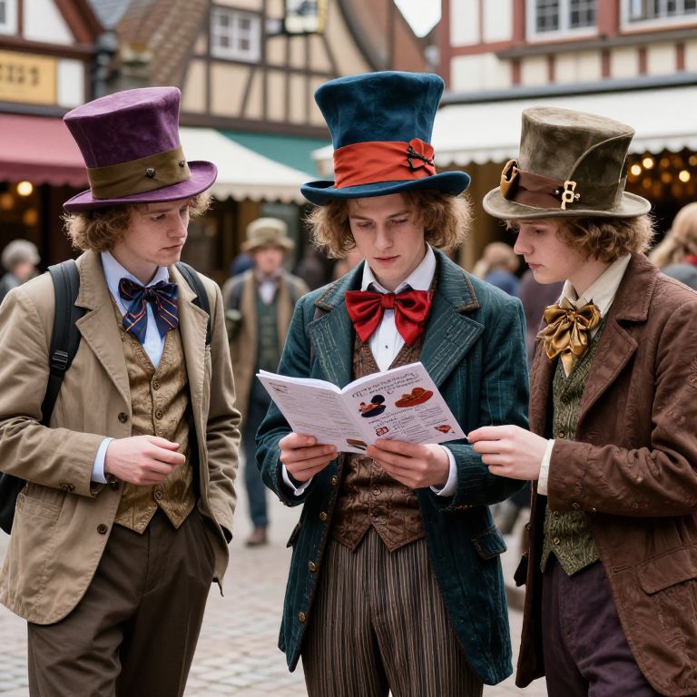 The Mad Hatter some young people are standing on the market place of Pleystein and some of them are looking into a brochure,
