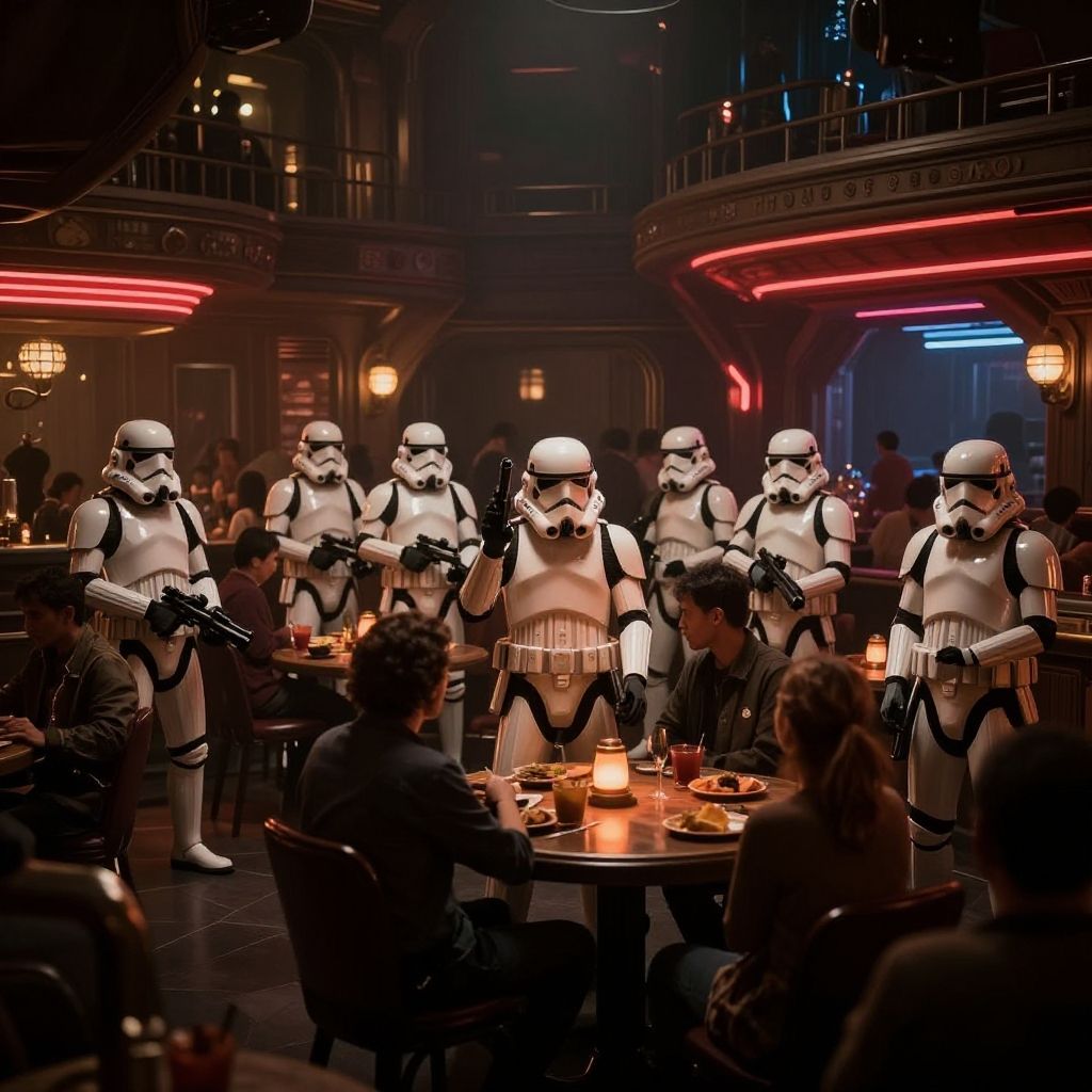 Photograph of Stormtroopers playing instruments at a dimly lit, neon-lit bar, surrounded by seated patrons with drinks. Retro sci-fi setting