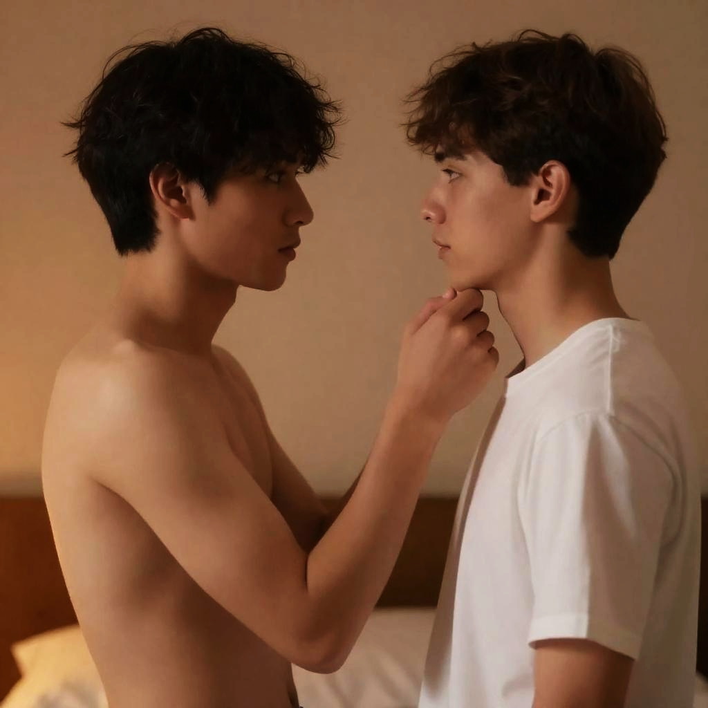 Photograph of two young men, shirtless, embracing closely. The man in front has short brown hair, visible from the back, wearing a string bikini top. The man behind has medium-length brown hair, looking serious. Wooden dresser with model sailboat on left, window with white curtains in background. Natural light.
