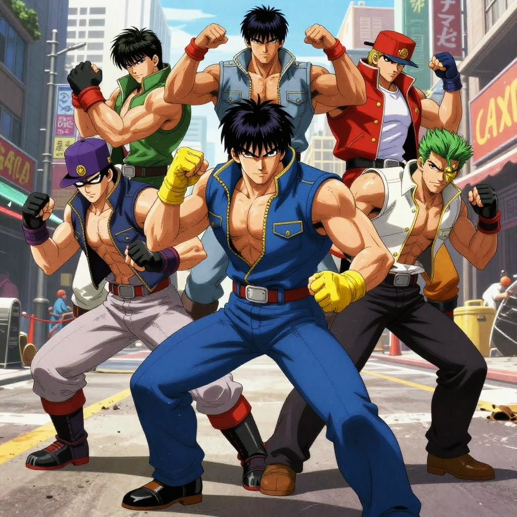 Detailed portrait of Final Fight characters in action poses, dynamic background of chaotic city streets, vibrant colors, gritty textures, stylized anime-inspired art style
