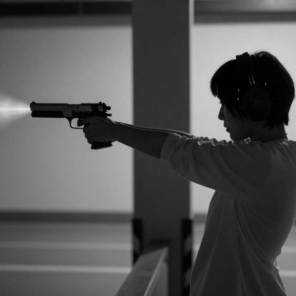 Silhouetted photograph of a person in a black outfit, crouching and aiming a gun with red laser beams crossing in front. Background includes brick walls, wooden beams, and a spotlight. The person's hair is tied back, and they are positioned to the right, with the laser beams originating from the left.