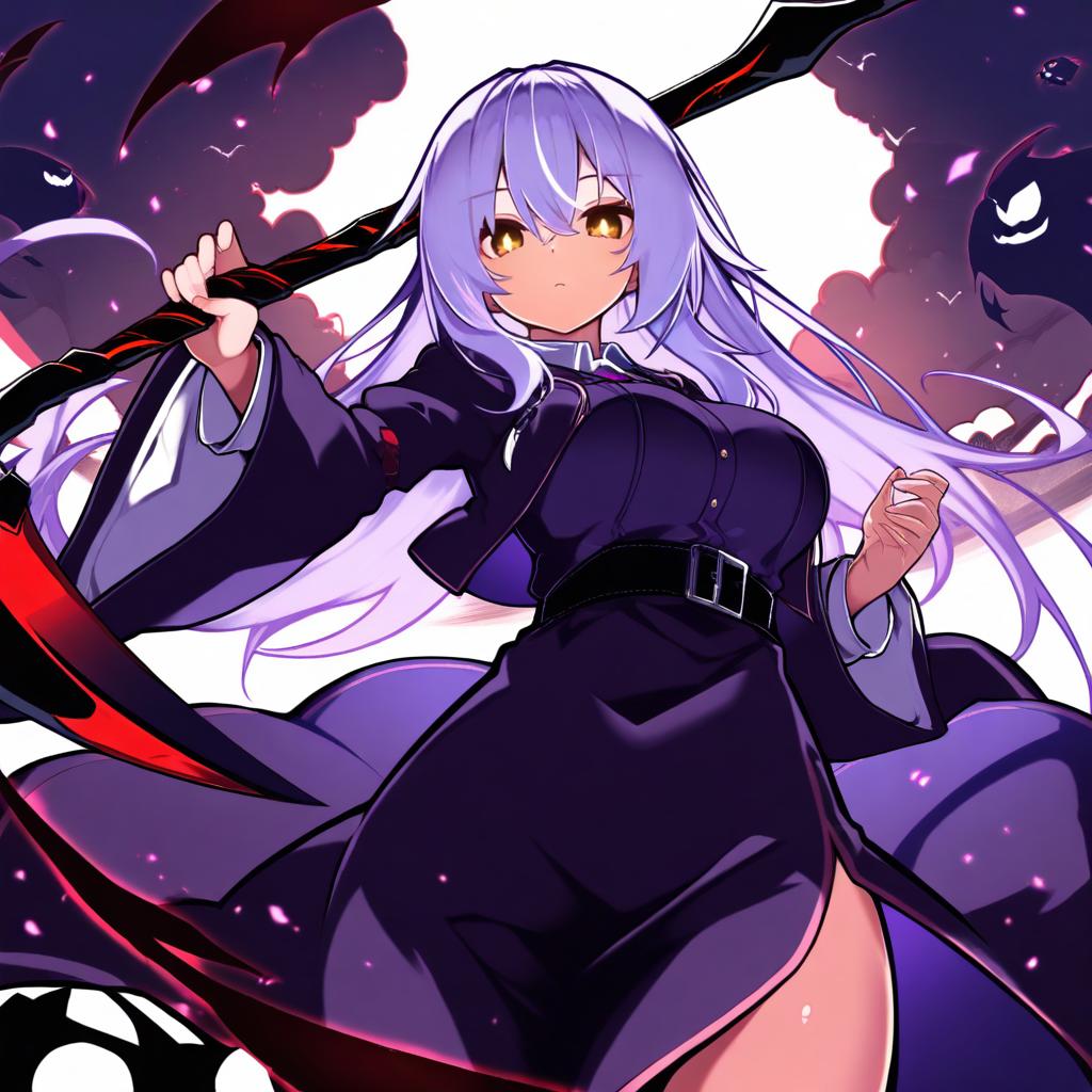 Grim reaper, original, 1girl, red eyes, long hair, scythe, by artist gin (shioyude), animagine