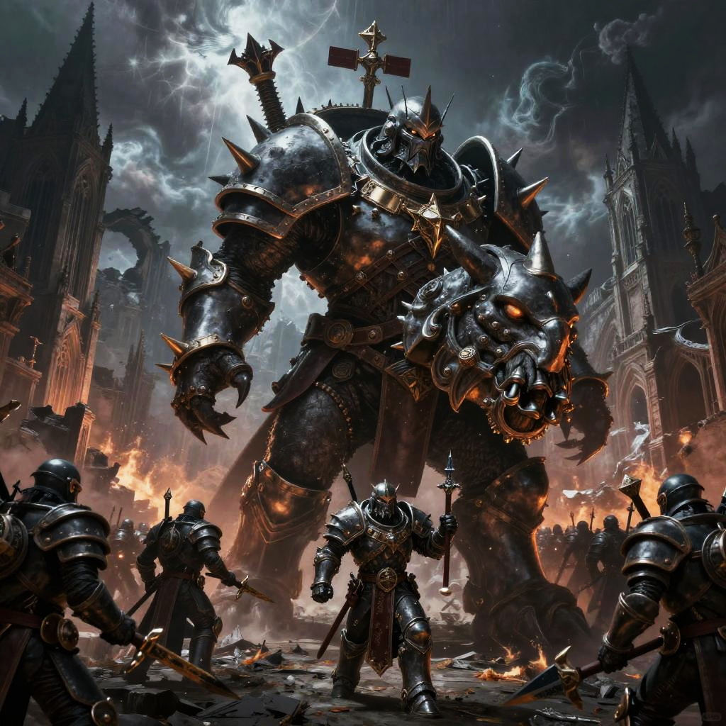Warhammer Fantasy Chaos warrior in heavy spiked armor mounted on a monstrous beast, leading a horde through a ruined gothic city engulfed in supernatural storms, dark and menacing atmosphere, vivid fantasy art with intricate textures