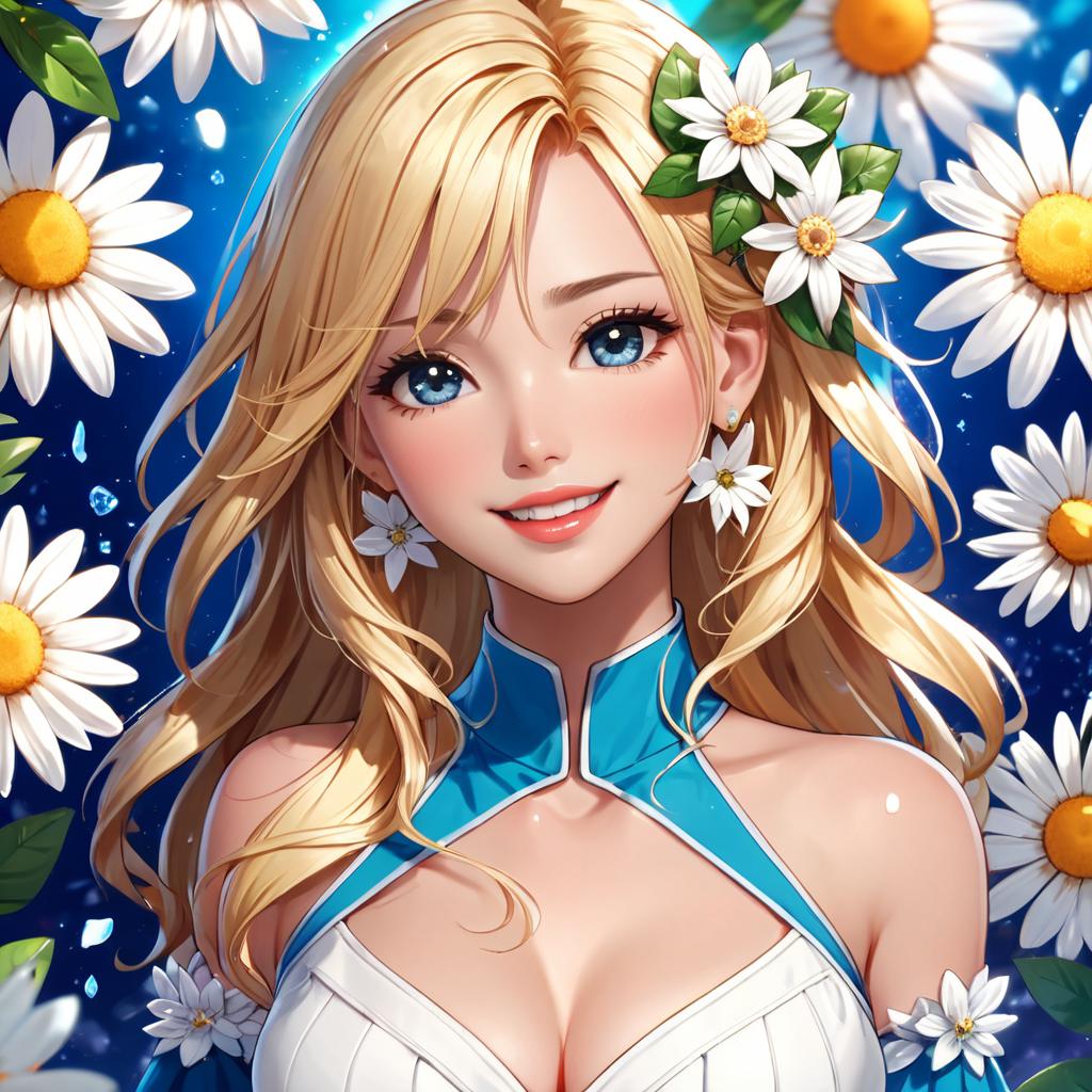 (masterpice, best quality, high quality, highres:1.4), extremely detailed, detailed skin, ambient soft lighting, 4K, 1girl, upper body, color splashes, line art, art, fibonacci, flower ornament, hair flower, white flowers, looking at viewer, smile, cleavage, blue eyes, closed mouth, abstract, blonde hair, long hair