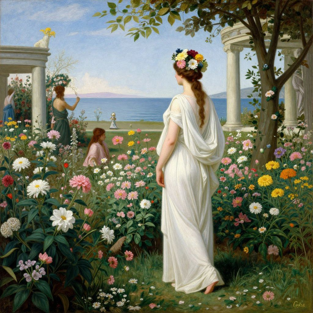 In the painting \"Gaia\" by Lawrence Alma-Tadema, a serene and lush garden scene unfolds. The foreground is dominated by a woman adorned in a flowing, white robe, her back turned to the viewer, as she gazes out over a vast, tranquil sea. Her attire is complemented by a headdress adorned with vibrant flowers, adding a touch of elegance and nature's beauty. Surrounding her are numerous blooming flowers in a riot of colors, including whites, pinks, and yellows, creating a sense of abundance and vitality. In the middle ground, another figure, partially obscured by the foliage, adds depth to the scene. The background features classical architectural elements, including columns and statues, suggesting a connection to ancient times and adding a sense of grandeur and history. The overall composition is balanced, with the sea and the distant horizon providing a calming backdrop to the lush garden and the figures within it. The interplay of light and shadow, as well as the detailed textures of the flowers and robes, enhances the realism and depth of the painting, making it a captivating depiction of a moment in time.