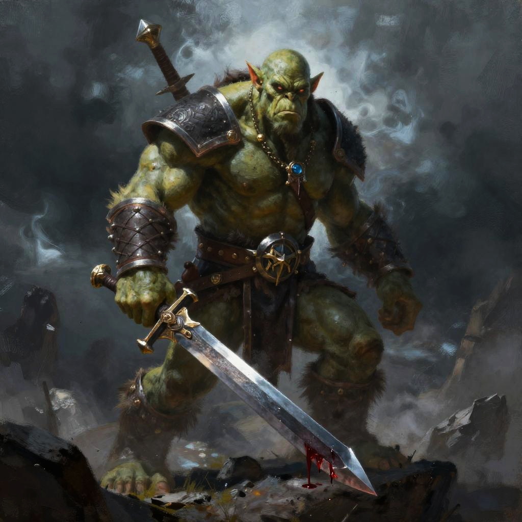 Digital painting of a muscular, green-skinned orc warrior with glowing eyes, wearing dark armor and holding a blood-stained sword, standing in a sm