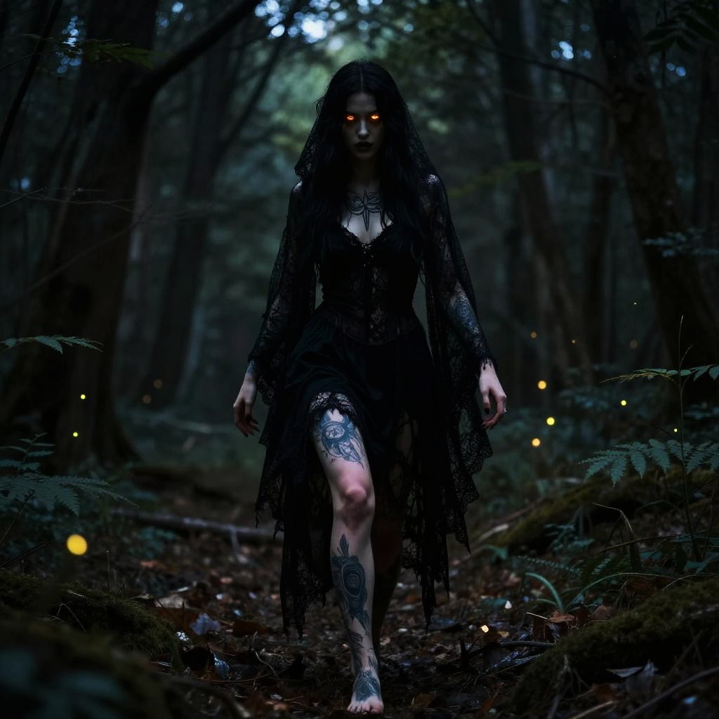 A dark, ghostly woman with glowing orange eyes walks barefoot through a dense, eerie forest at dusk. She wears a tattered black lace dress and veil, revealing glowing tattoos on her arms and legs. The atmosphere is mysterious and haunting, enhanced by shadows and flickering fireflies around her.