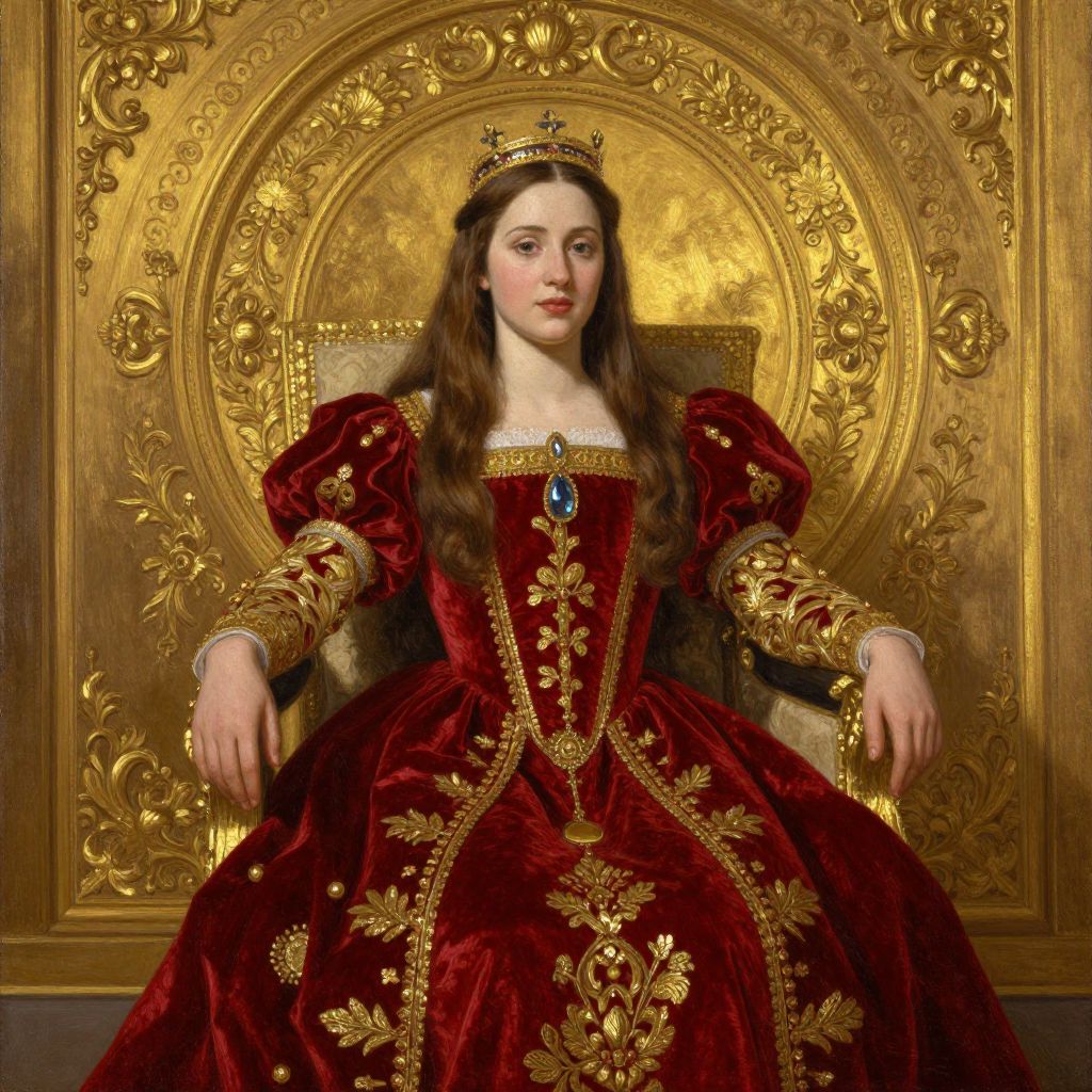 The image depicts a beautifully rendered oil painting of a woman, likely a queen, adorned in a regal red velvet dress with intricate gold embroidery. Her long brown hair cascades down her back, and she is elegantly seated on a throne-like chair. The background features a circular, ornate gold frame with elaborate floral designs, adding to the opulence of the scene. The woman's attire and the throne suggest a setting of power and nobility, with the gold detailing on her dress and the throne's armrests enhancing the luxurious atmosphere. The overall composition is balanced, with the woman centrally positioned and the gold frame creating a sense of depth and focus. The interplay of colors, from the rich red of the dress to the shimmering gold, creates a visually striking and dynamic image.