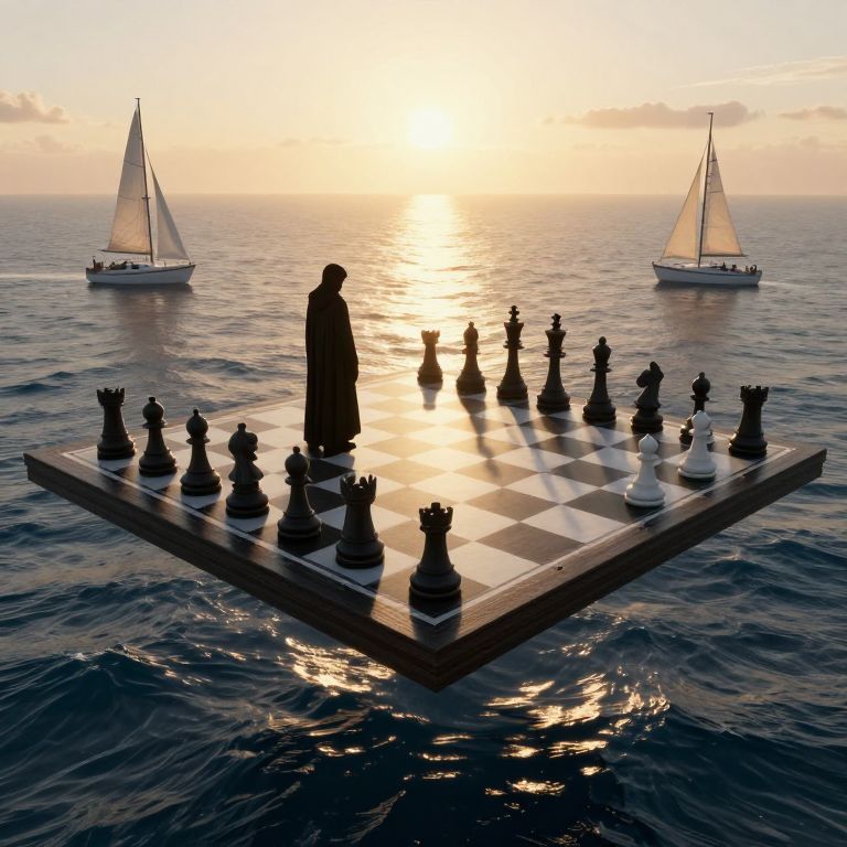 A digital illustration depicts a silhouetted figure standing on a floating chessboard in the middle of a calm ocean at sunset. The chessboard has black and white pieces arranged, with two sailboats in the background on either side. The sun is low on the horizon, casting a golden reflection on the water. The silhouetted figure, dressed in a long coat, stands near the center of the board, which is slightly tilted. The ocean's surface is smooth, with gentle waves. The image evokes a sense of calm and strategic contemplation, blending elements of nautical and chess themes.