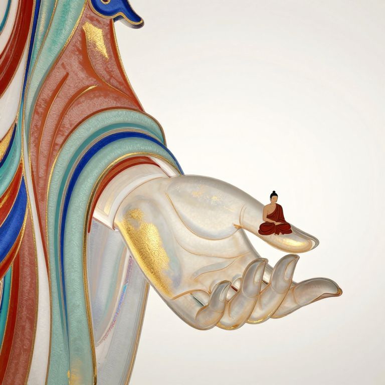 Dunhuang Art, minimalism illustration, mural art, an extremely tiny monk sitting on the giant hand of Guanyin an extremely tiny monk sitting on the giant hand of Guanyin, perfectly interwoven curves, chinese ink style, chinese freehand style, frosted texture, gold red indigo color scheme, dunhuang mogao grottoes color scheme, ripples of color diffusing, printmaking style, layered curves, rich color, made of transparent frosted glass, simple background, bright environmental lighting, warm and shining tone, capillary phenomenon, diffraction, total internal reflection