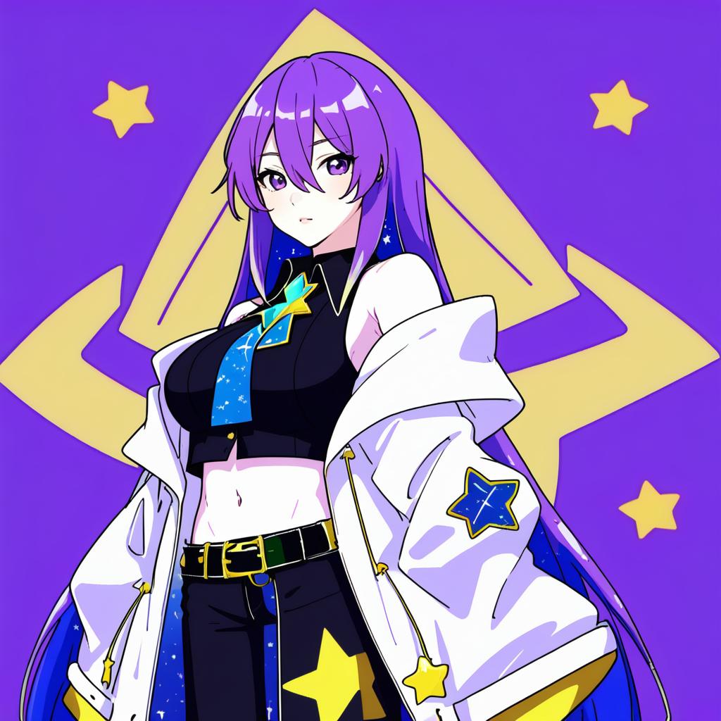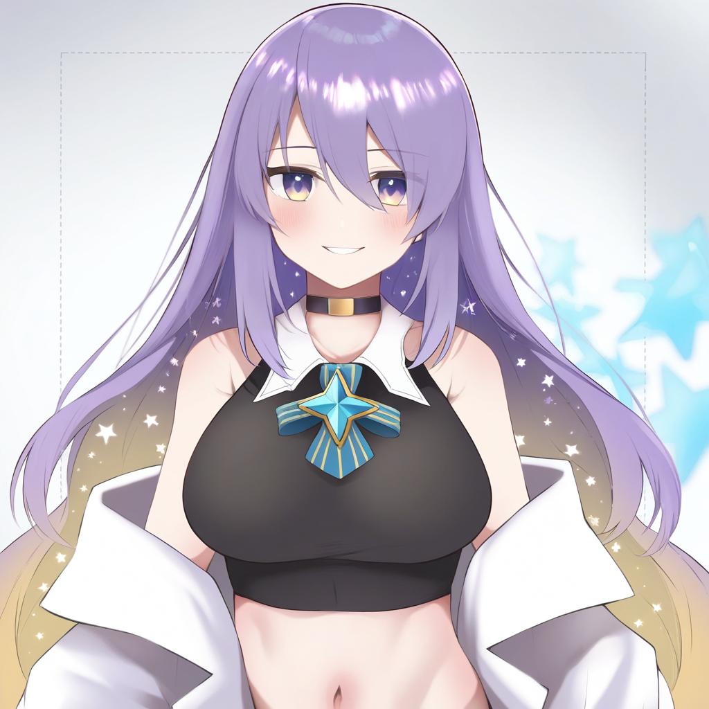 Moona hoshinova (1st costume), hololive, 1girl, purple eyes, hair between eyes, purple hair, starry hair, colored inner hair, blonde hair, long hair, gradient hair, two-tone hair, very long hair, large breasts, navel, white jacket, black shirt, sleeveless shirt, off shoulder, black choker, bare shoulders, virtual youtuber, virtual youtuber, crop top, star (symbol), midriff, by artist skeptycally, anime