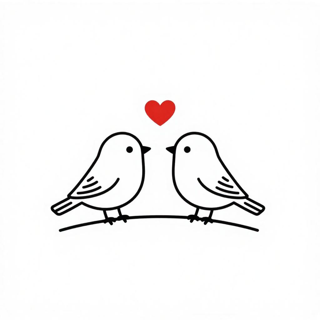A minimalist digital drawing of two simple, black-lined birds perched on a thin branch, facing each other with a small red heart between them. The birds are outlined without detailed feathers, giving a clean and elegant look. The background is plain white, making the red heart and black lines stand out. The overall style is cute and romantic.