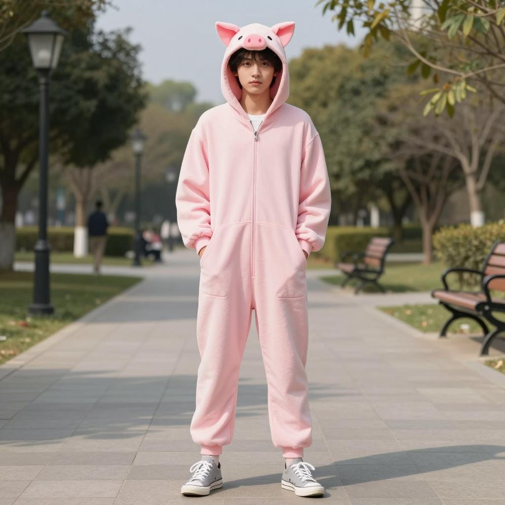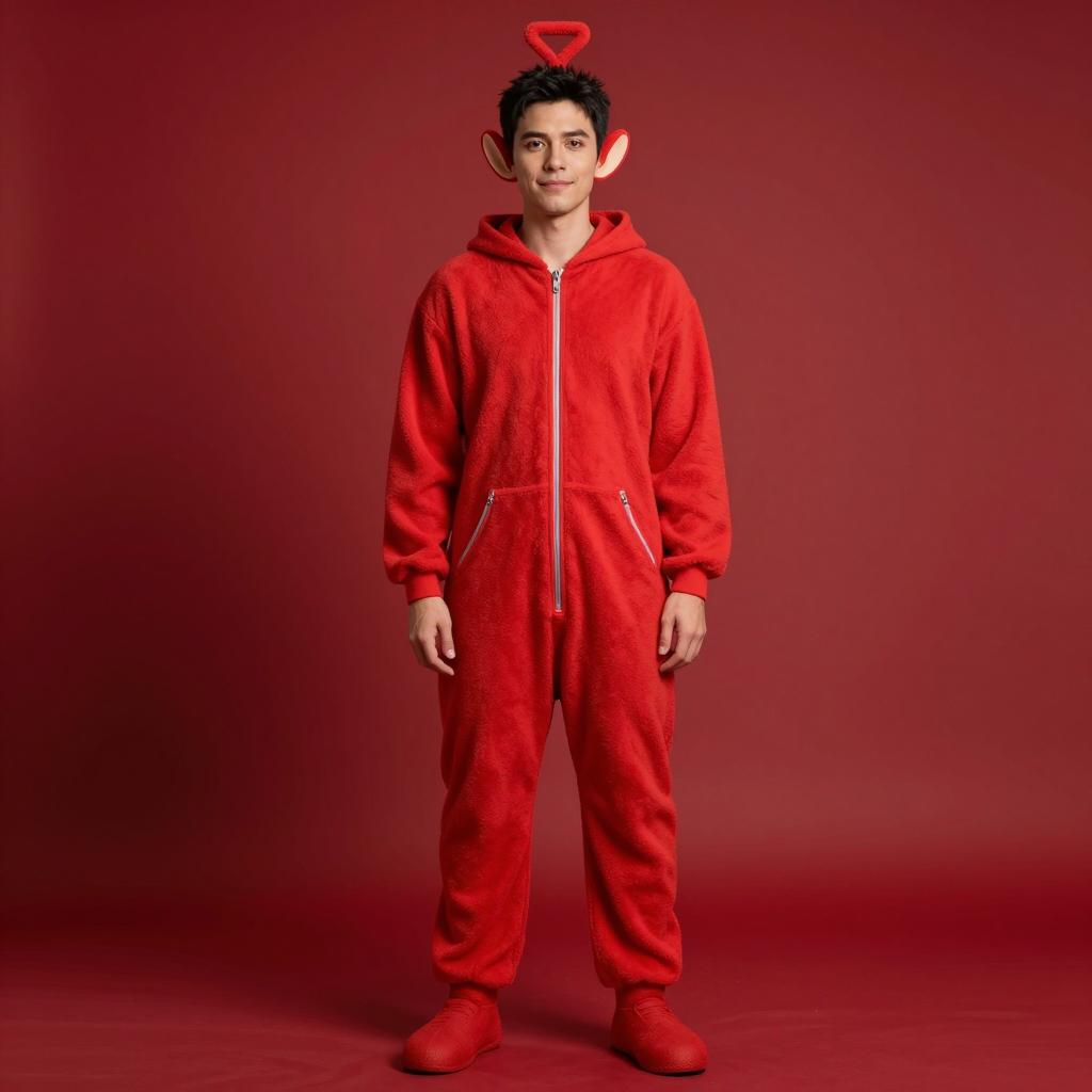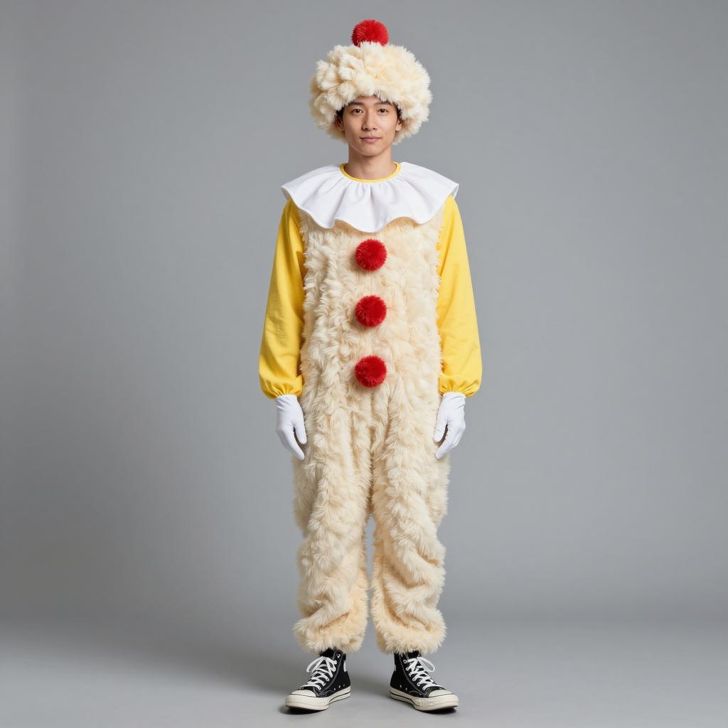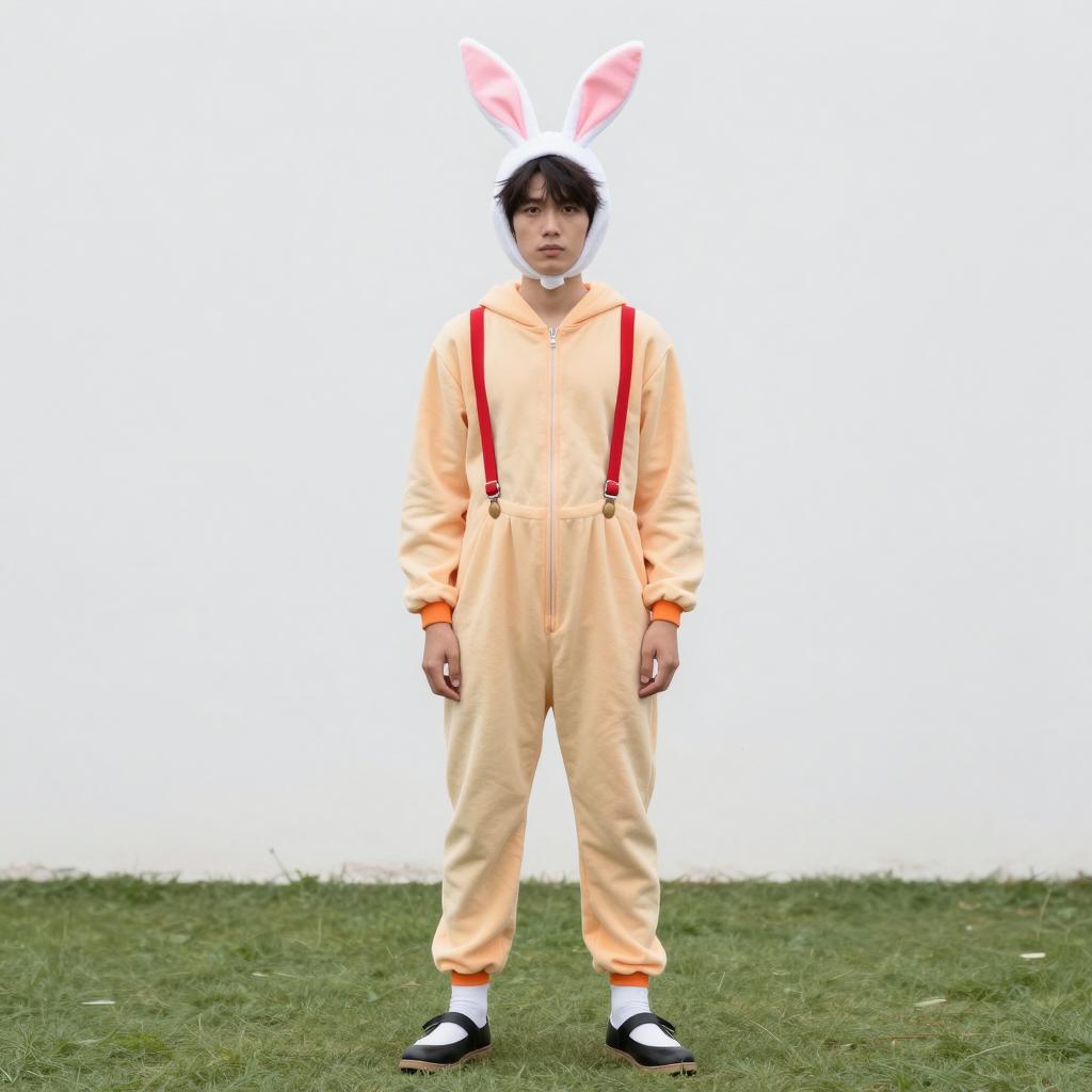 Easter day costume, photograph of a person standing on grass, wearing a light orange onesie, white bunny ears hat, red suspenders, white socks, black and white shoes, plain white background, full body shot, neutral expression, daytime, casual outfit, cosplay, realistic style, slight motion blur, vertical orientation