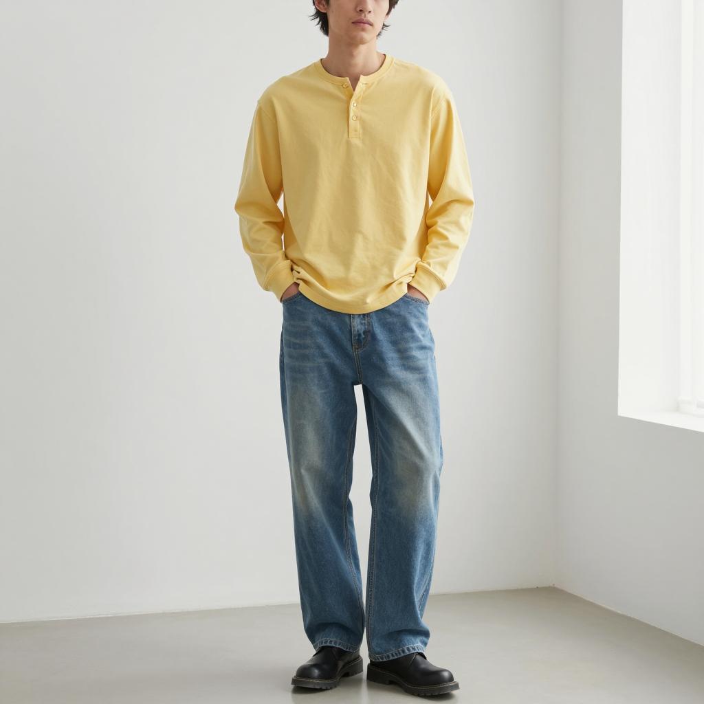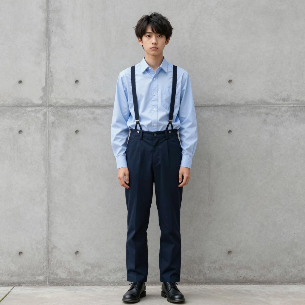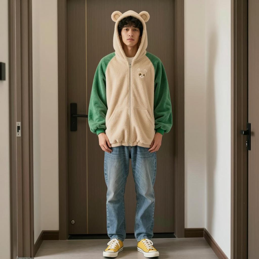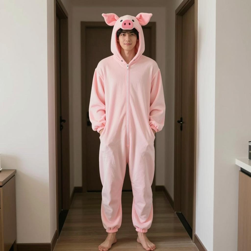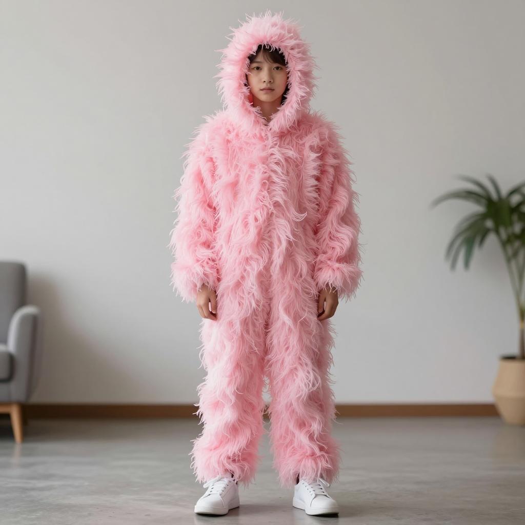 Easter day costume, photograph of a person standing on grass, wearing a light orange onesie, white bunny ears hat, red suspenders, white socks, black and white shoes, plain white background, full body shot, neutral expression, daytime, casual outfit, cosplay, realistic style, slight motion blur, vertical orientation