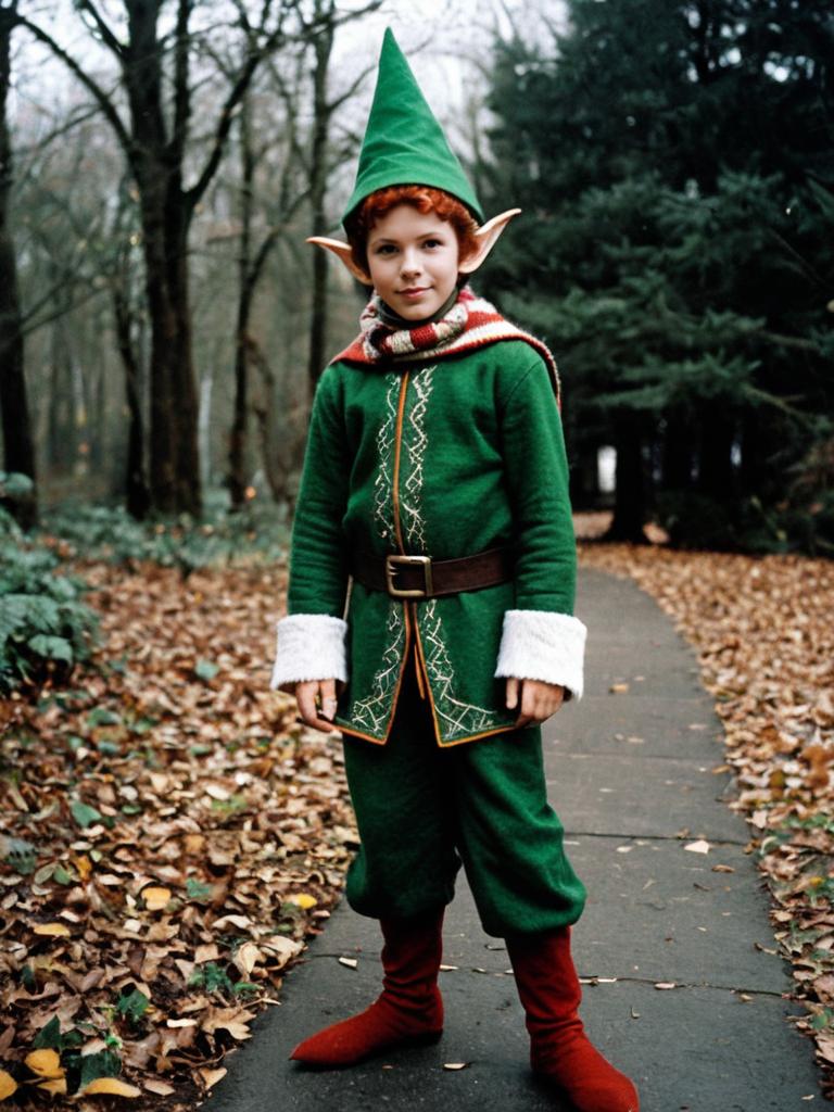 Quality elf costume, 1boy, pointy ears, male focus, solo, hat, scarf, full body
