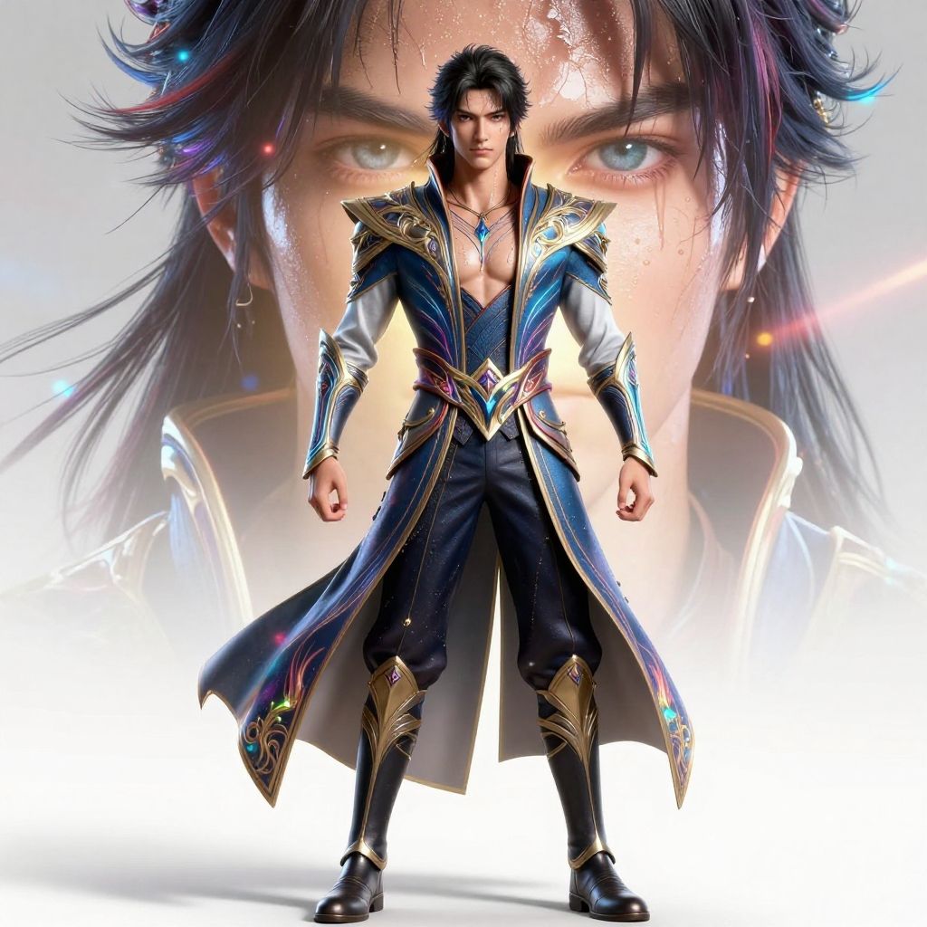 ((top quality, 8k wallpaper)), (masterpiece, best quality:1.2), (high_resolution:1.2), (ultra details:1.2), (sweaty), extreme quality, detailed face+eyes, (bright colors), vivid colors, highres, high resolution:1.2, extremely detailed, realistic, intricate details, 1boy, tall, (collarbone:1.2), flowing hair, intricate magical armor and intricate flowing glowing cothes, full shot, boots, perfect anatomy, correct proportions, 4 fingers and 1 thumb per hand