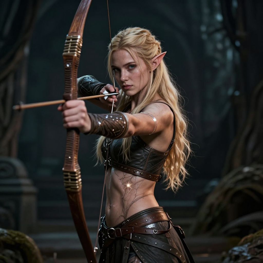 Photorealistic digital art of a blonde, elven archer with pointed ears, wearing a black leather top and arm guards, aiming a wooden bow