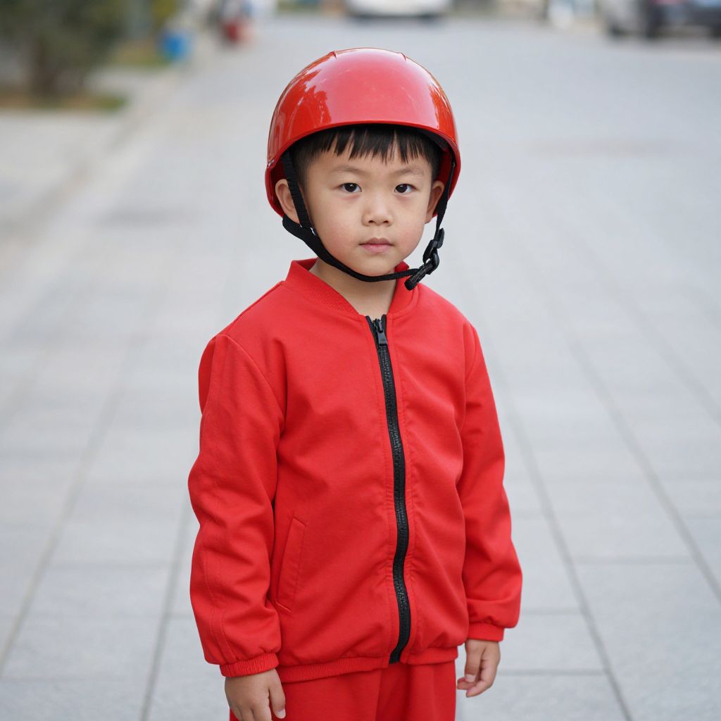 Red Car Costume, young boy wearing a red jacket and a red helmet