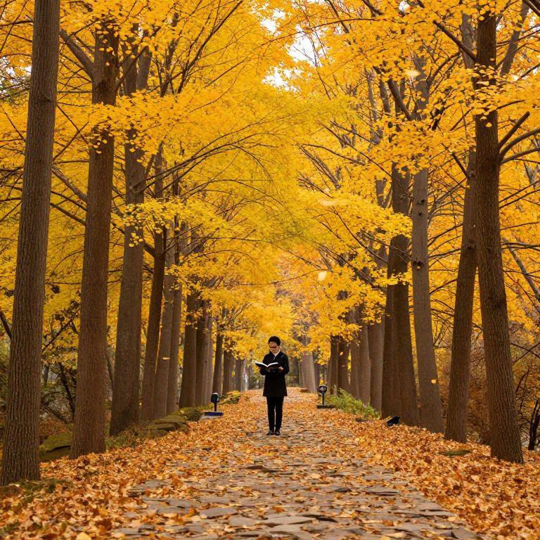 A solitary figure stands amidst a vibrant autumn forest, enveloped by golden leaves that cascade gently from towering trees, while reading a book on a stone path lined with fallen foliage.
