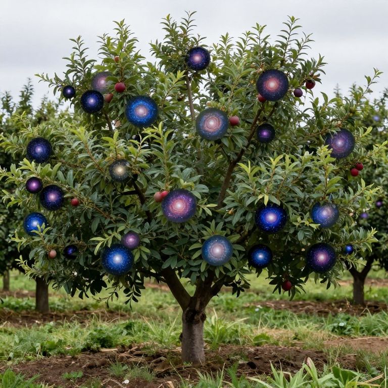 In this orchard, trees bloom not with fruit but with miniature galaxies, each one changing star patterns with the seasons.