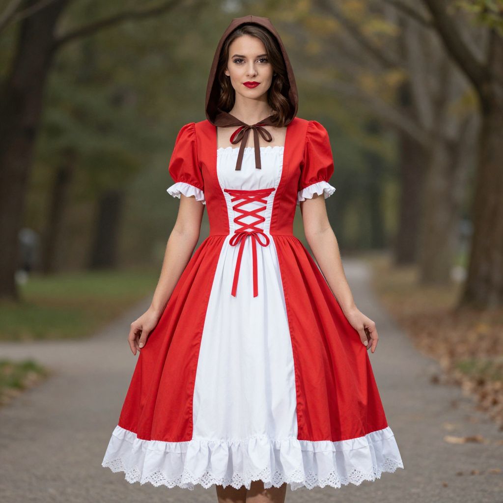Tudor Fancy Dress Costume, woman in a red and white dress and a brown hood