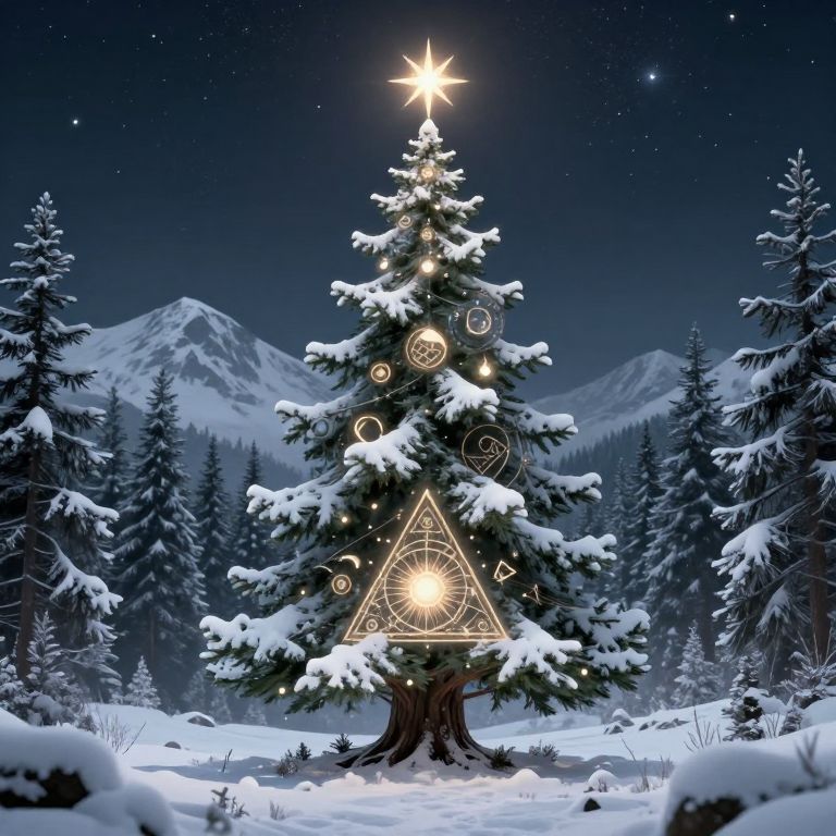 Digital artwork of a snow-covered Christmas tree adorned with glowing magical symbols, topped with a bright star, set against a starry night sky and snowy mountains