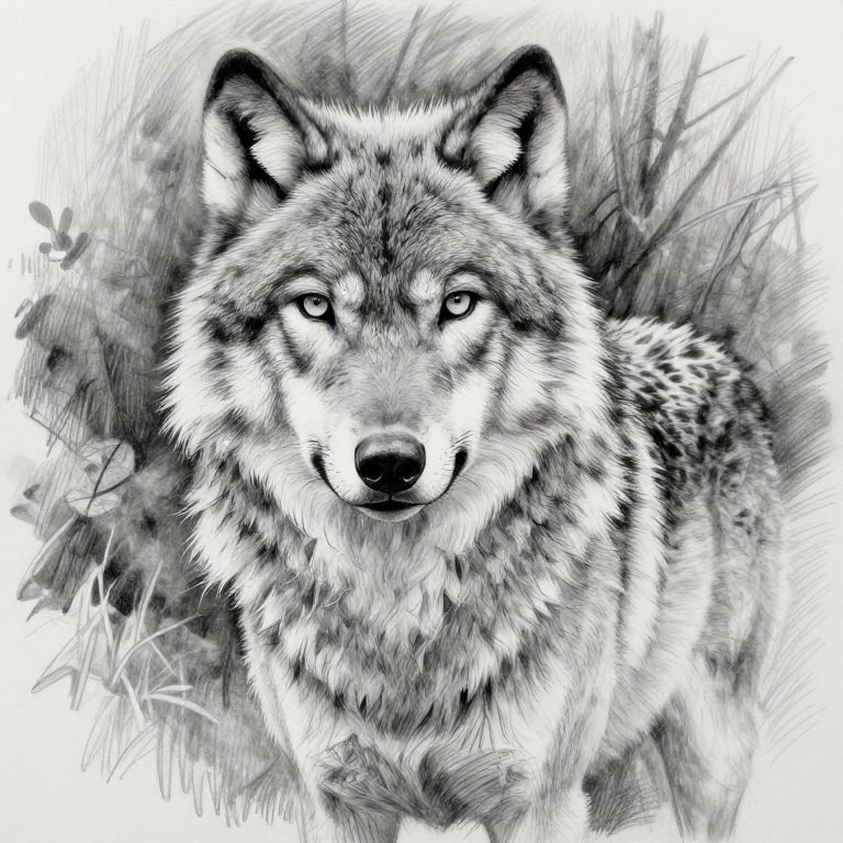 Realistic pencil wolf drawing, detailed fur texture and lifelike eyes, natural pose in a forest background, soft shading, high contrast, intricate pencil strokes capturing the wild spirit of the wolf, monochrome sketch style.