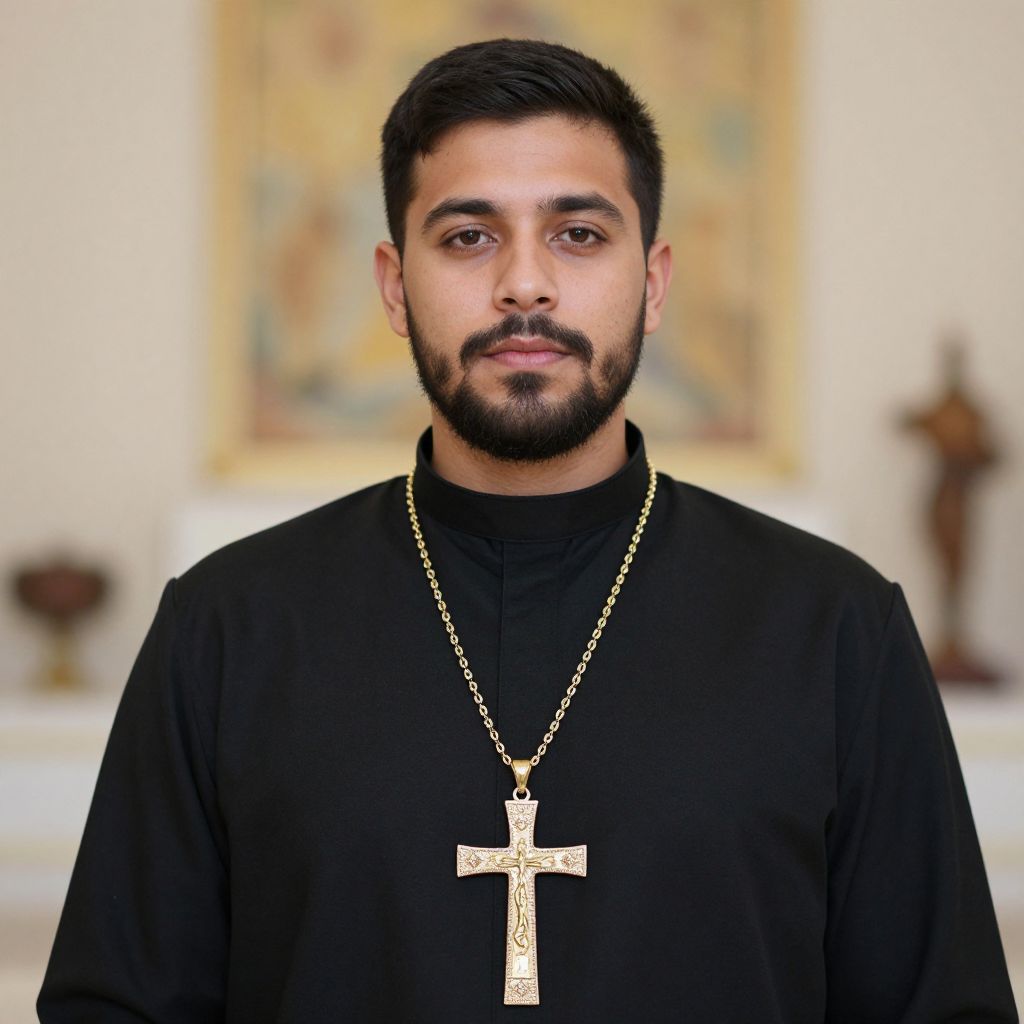 Priest robe costume, 1boy, cross, male focus, solo, jewelry, necklace, facial hair, cross necklace, beard, priest, black hair, robe, looking at viewer, mustache, latin cross, upper body, blurry