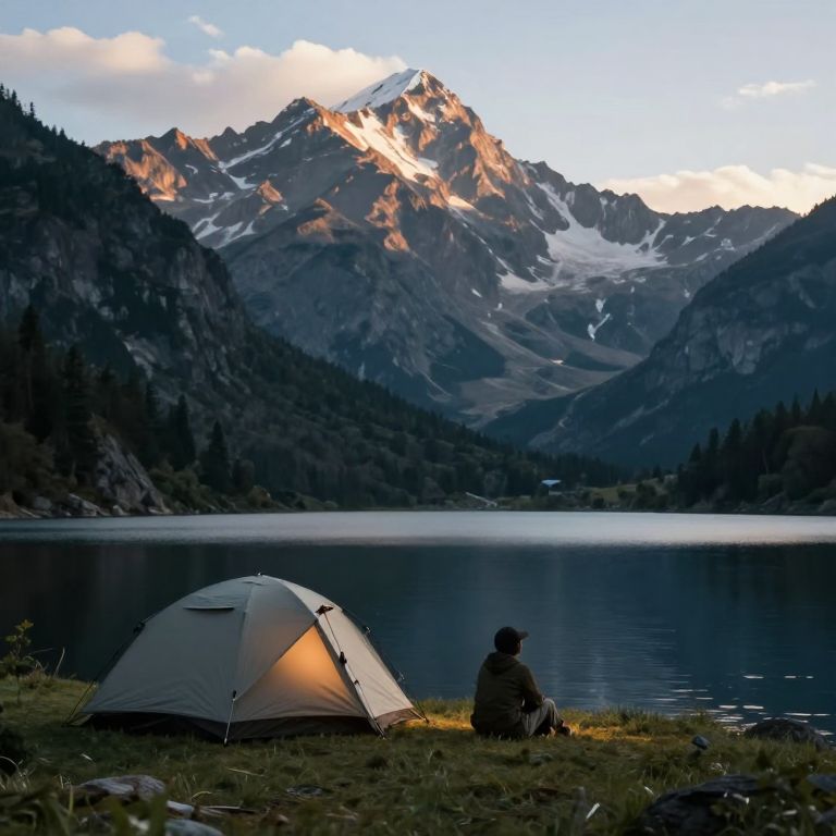 Serenity whispers through the still waters and mountain shadows, as a solitary camper finds solace in the embrace of nature’s quiet majesty, embodying the timeless dance between solitude and connection.
