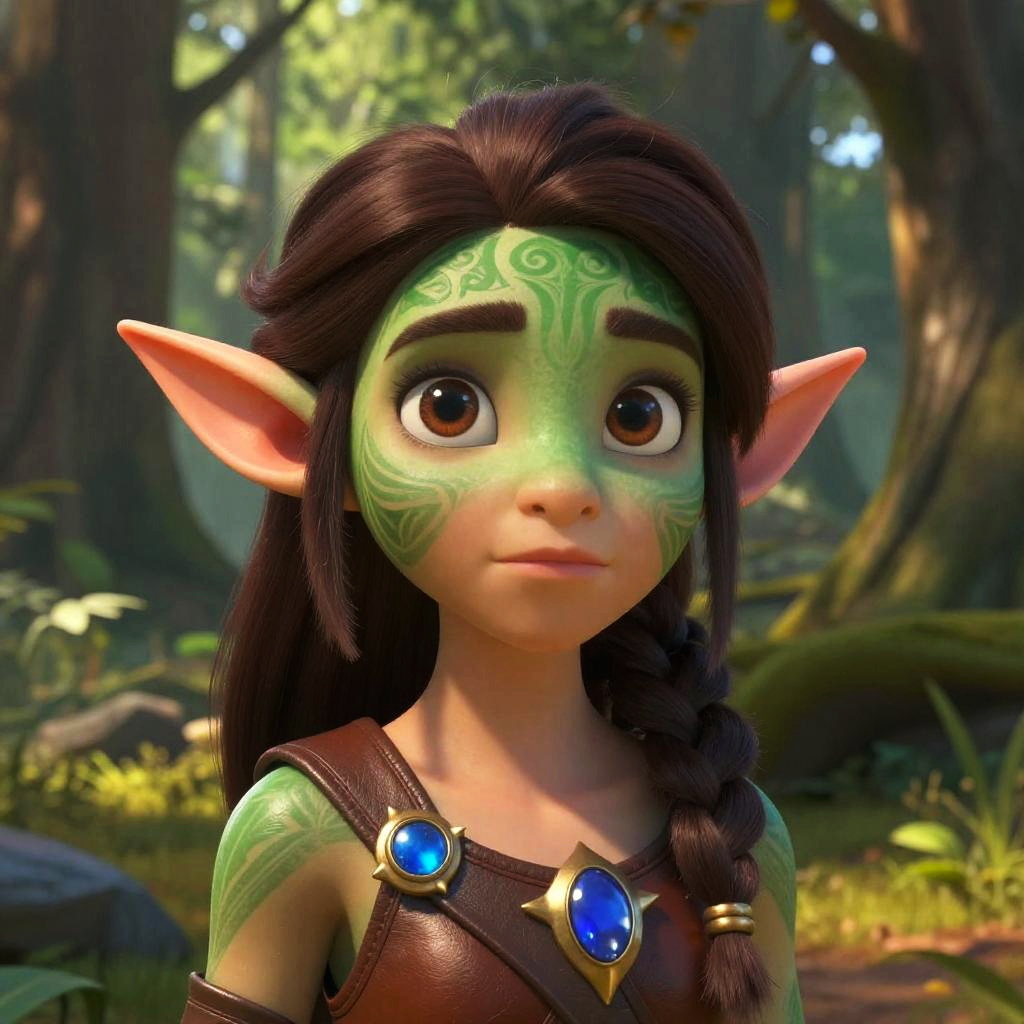 This is a digital CGI rendering of a young, green-skinned, elf-like girl with large, pointed ears and expressive brown eyes. Her dark brown hair is braided to one side. She has intricate, glowing green patterns on her forehead and cheeks. She wears a brown leather vest adorned with blue gemstones. The background is a lush, sunlit forest with tall trees and green foliage. The image has a vibrant, animated style, reminiscent of characters from fantasy films. The girl's expression is neutral, and she stands slightly off-center in the foreground, with the forest blurred in the background.