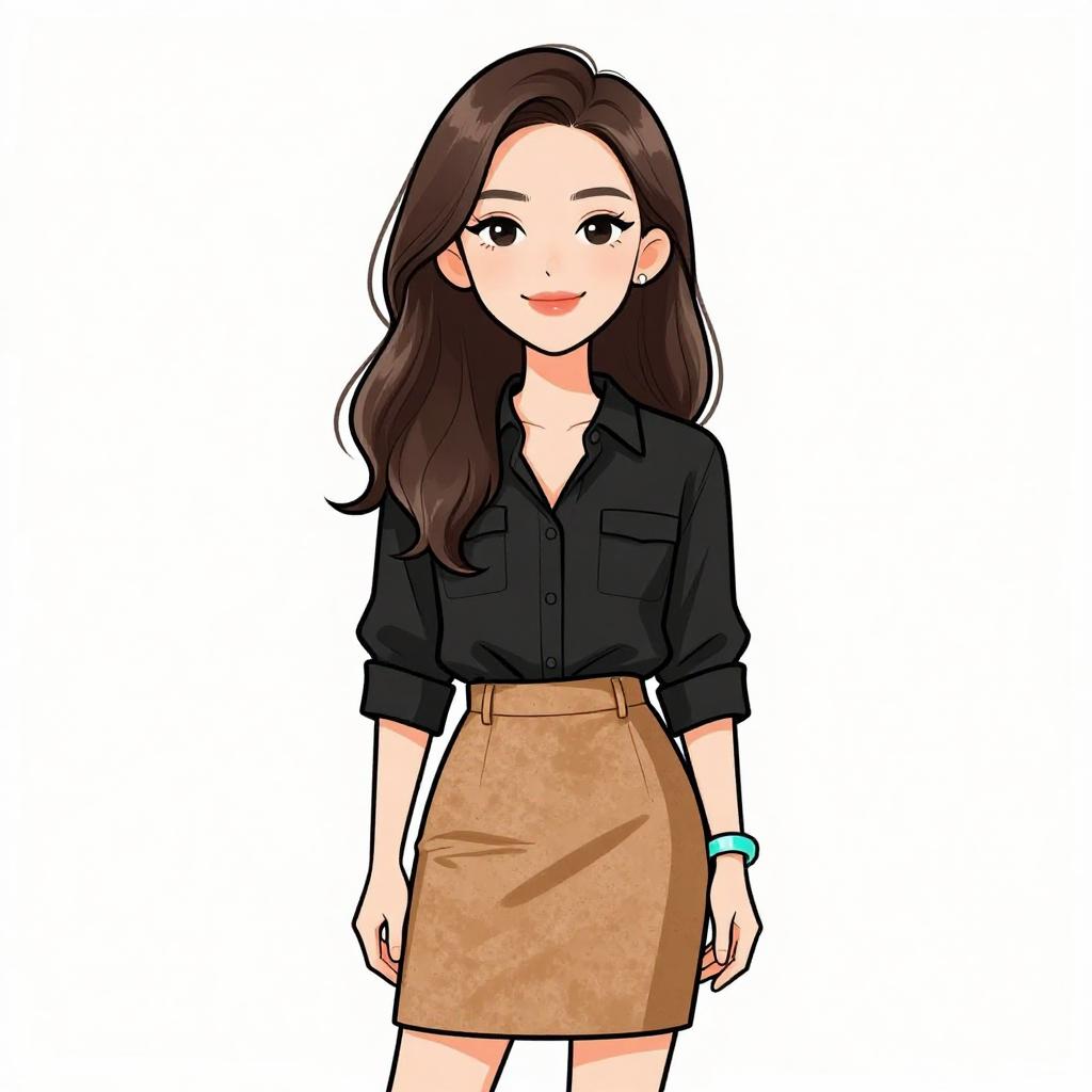 Illustration of a woman with long wavy brown hair and a pretty face, smiling. She is wearing a casual chic outfit consisting of a black button-up blouse with two front pockets and rolled-up sleeves, paired with a tan A-line suede skirt that sits at the waist. She accessorizes with a large turquoise cuff bracelet on her right wrist and minimal makeup, presenting a modern and elegant look.