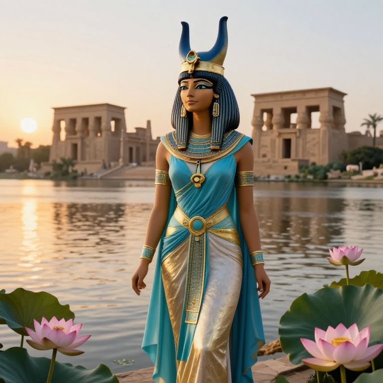 Egyptian goddess Isis in flowing blue and gold robes, intricate jewelry with scarab motifs, standing by the Nile river at dawn, lotus flowers blooming, detailed background of ancient temples, mystical and serene mood, vibrant colors