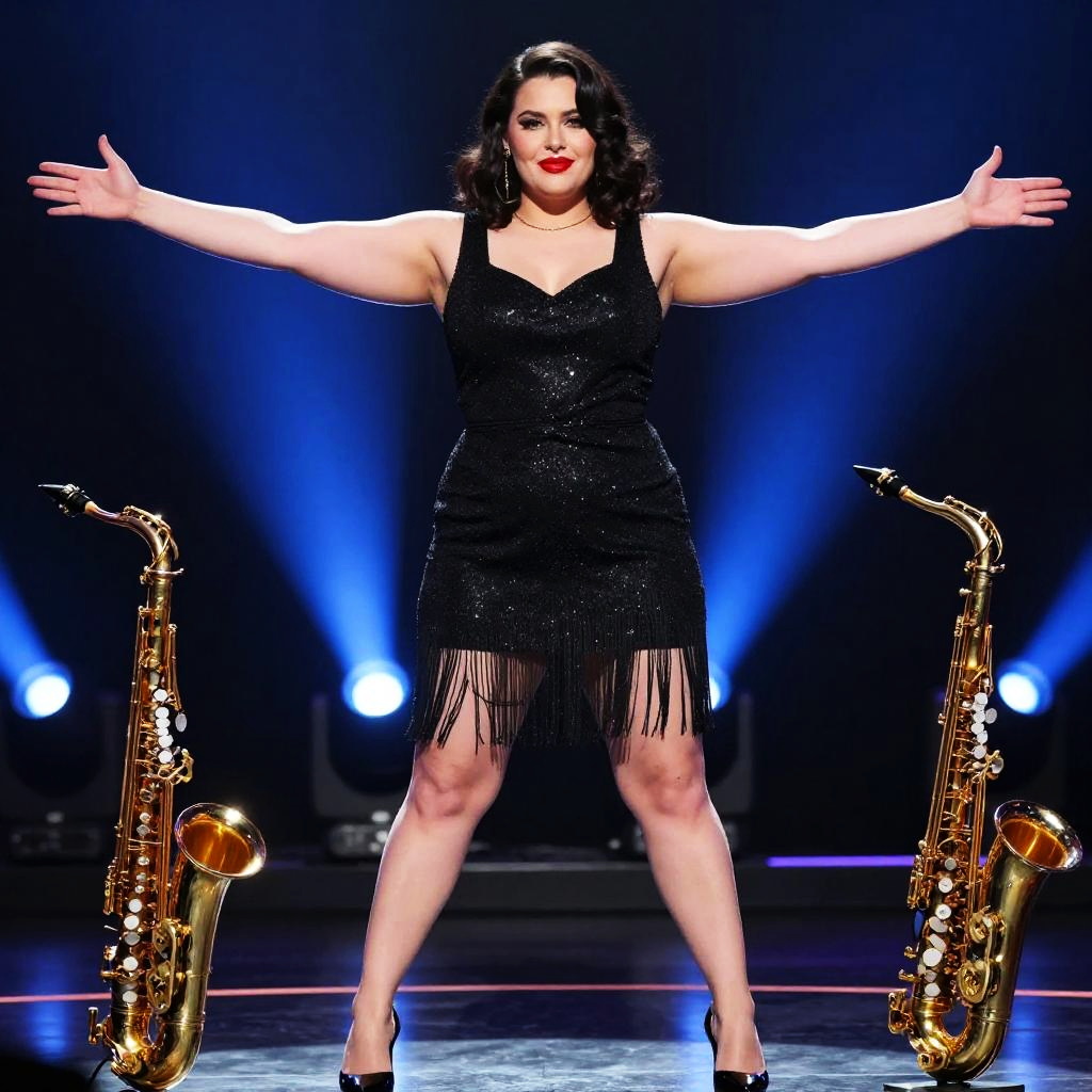 Photograph of a curvy woman with fair skin and dark, wavy hair, striking a confident pose with arms outstretched. She's wearing a sparkly, black, sleeveless dress with a fringe skirt and black high heels. Flanking her are two golden saxophones, positioned on either side. Blue stage lights create a dramatic background, highlighting her red lipstick and glamorous look.