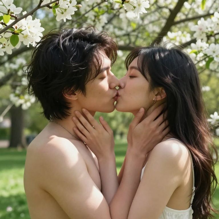 Photograph of a young, shirtless Asian couple kissing outdoors under blooming white cherry blossoms. The man, with short, tousled black hair, and the woman, with long, straight black hair, both have fair skin. The woman wears a white strap top, and they are touching each other’s faces gently. The background shows a blurred, sunlit green park with tree branches and flowers, creating a romantic and serene atmosphere. The couple's hands are tenderly cradling each other's necks and faces.