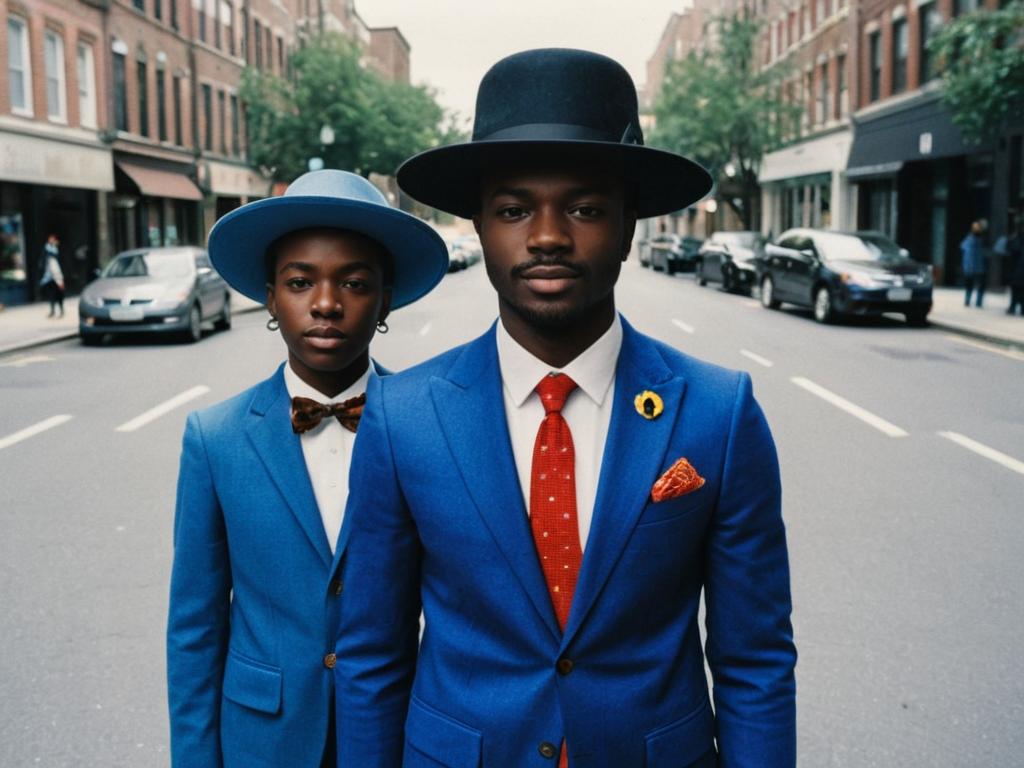 Lil Nas Fancy Dress face swap, dressed in a blue suit and hat standing on a street