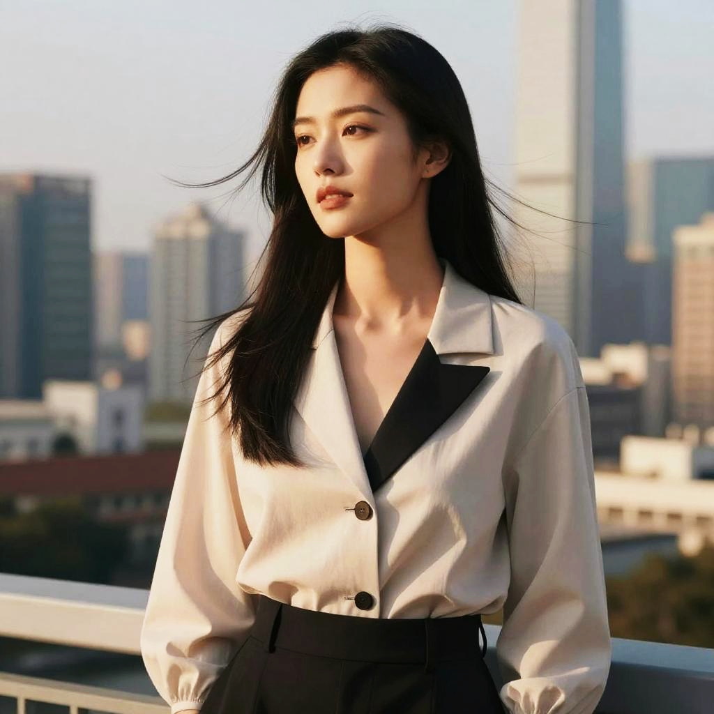 Asian blond hair tied in a chic bun, traditional Asian architecture in the background, soft golden hour light, elegant and minimalist fashion styling