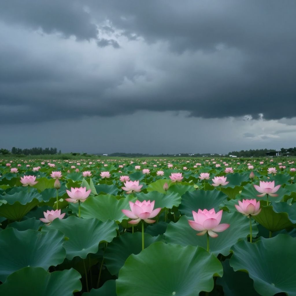 Photograph of a vast lotus field with pink lotus flowers under a dramatic, cloudy sky. Dark clouds loom overhead, contrasting with the bright