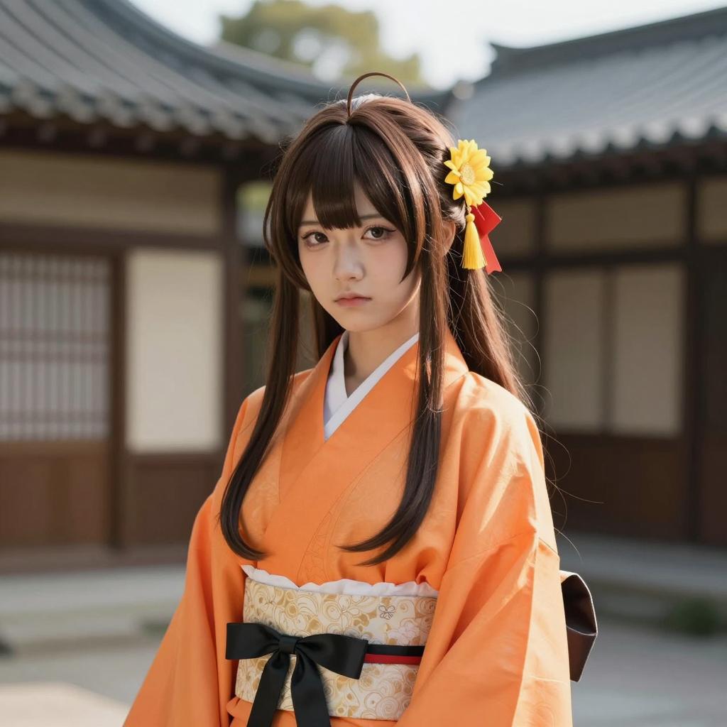 Girl cosplay costume, digital art of a cute anime girl, long brown hair with yellow flower, wearing an orange kimono with black ribbon, standing in front of traditional Asian building, daytime, soft sunlight, serious expression, detailed hair, realistic shadows, slight blur background, slight bokeh effect, realistic yet slightly stylized, modern anime style, photograph-like quality, slight fantasy element, outdoors, traditional and modern mix