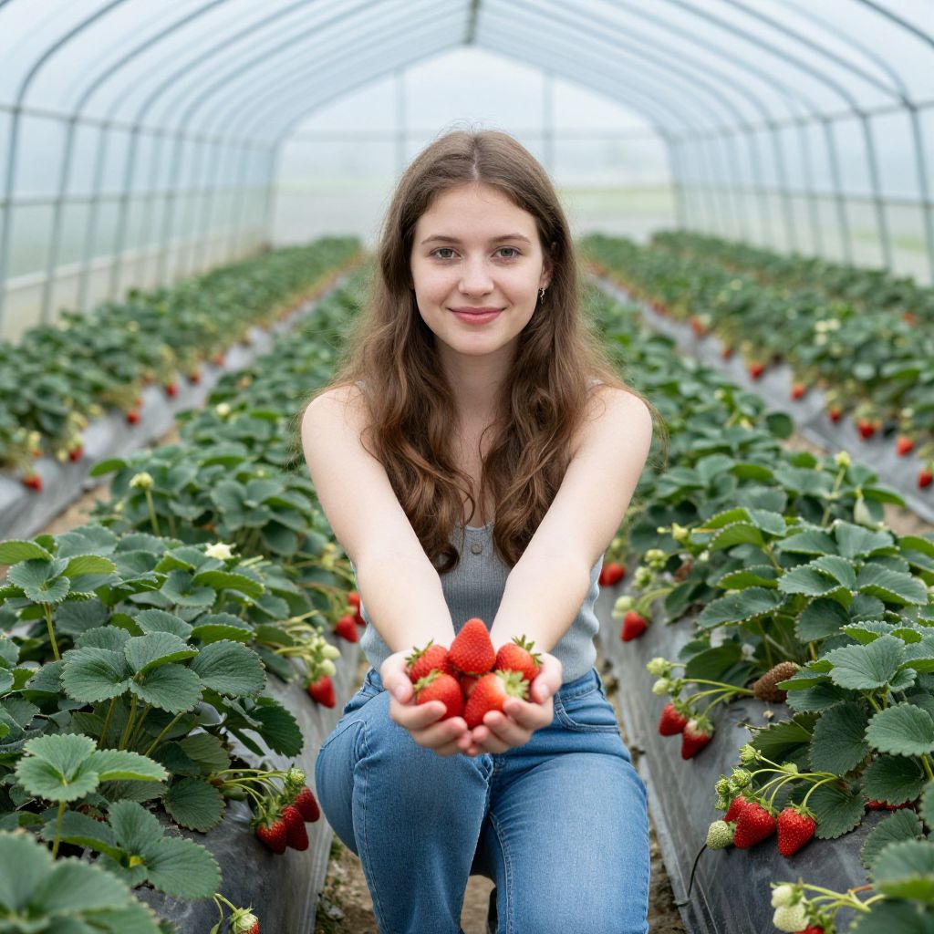 Photograph of a young white woman with long brown hair, wearing a gray sleeveless top and blue jeans, kneeling in a lush strawberry greenhouse. She is smiling and holding a cluster of bright red strawberries out towards the camera. The greenhouse has a transparent, arched roof, allowing natural light to illuminate the rows of green strawberry plants with ripe and unripe berries. The background shows a long, straight path lined with strawberry plants, stretching into the distance. The overall scene is vibrant with green and red colors, evoking a fresh and natural atmosphere.