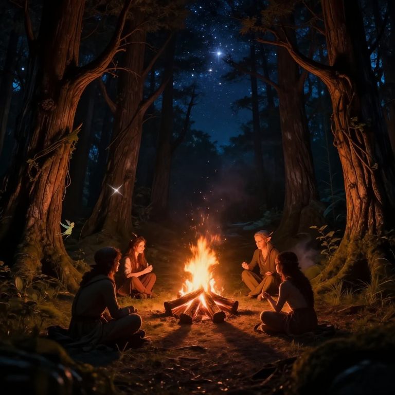 Fantasy campfire art depicting an ancient woodland clearing with a crackling campfire, mythical beings like elves and faeries sharing stories, intricate bark textures, glowing firelight casting dynamic shadows, and a celestial night sky filled with twinkling stars.